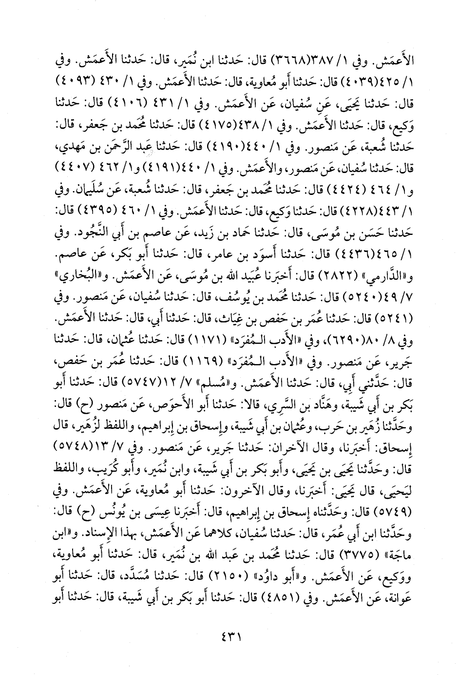 و «ابن ماجة» (٣٧٧٥) قال: حدثنا محمد بن عبد الله بن نمير، حدثنا أَبو معاوية، ووكيع، عن الأعمش. و «أَبو داود» (٤٨٥١) قال: حدثنا أَبو بكر بن أَبي شيبة، حدثنا أَبو