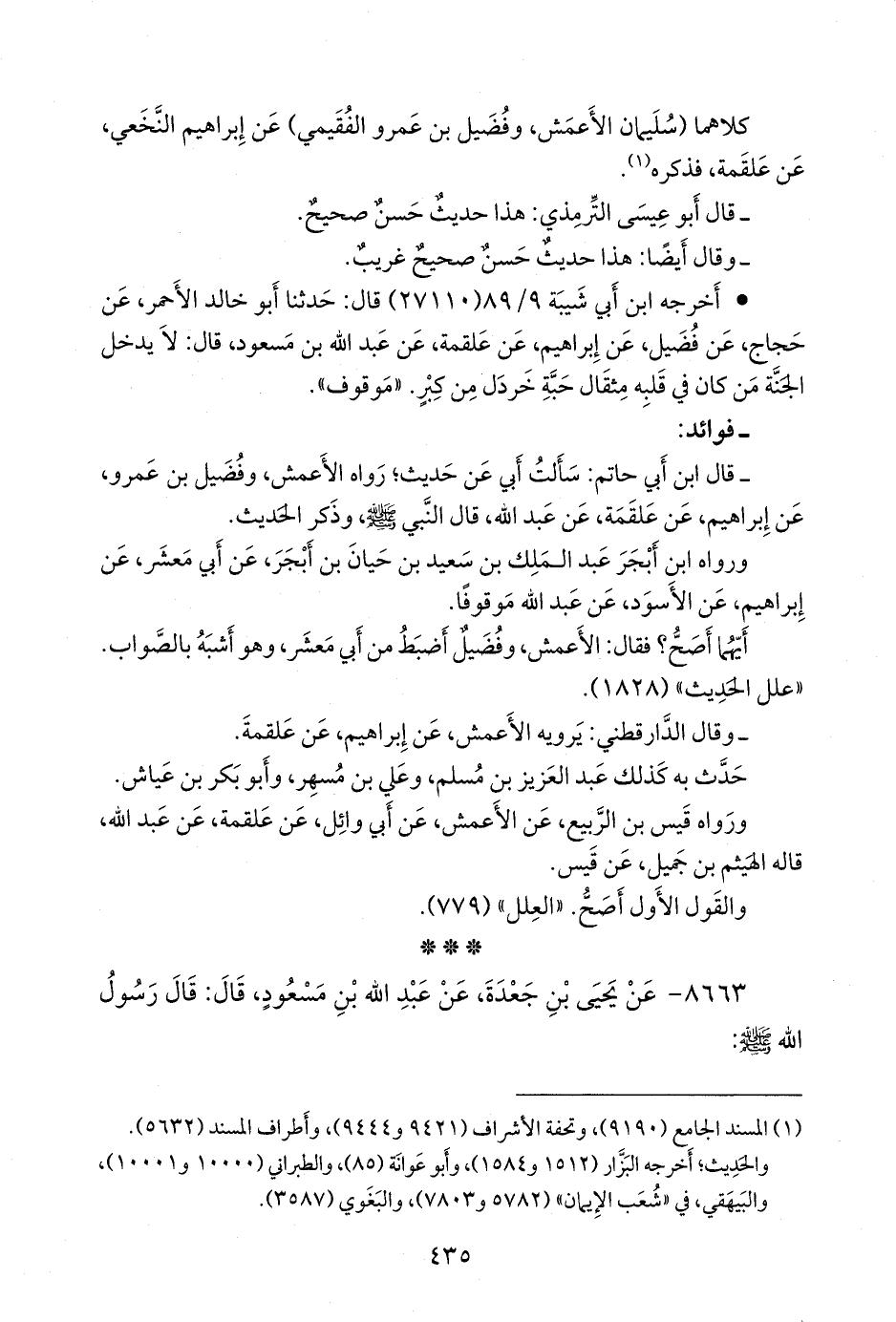 - قال ابن أبي حاتم: سألت أبي عن حديث؛ رواه الأعمش، وفضيل بن عَمرو، عن إبراهيم، عن علقمة، عن عبد الله، قال النبي صَلى الله عَليه وسَلم وذكر الحديث.
