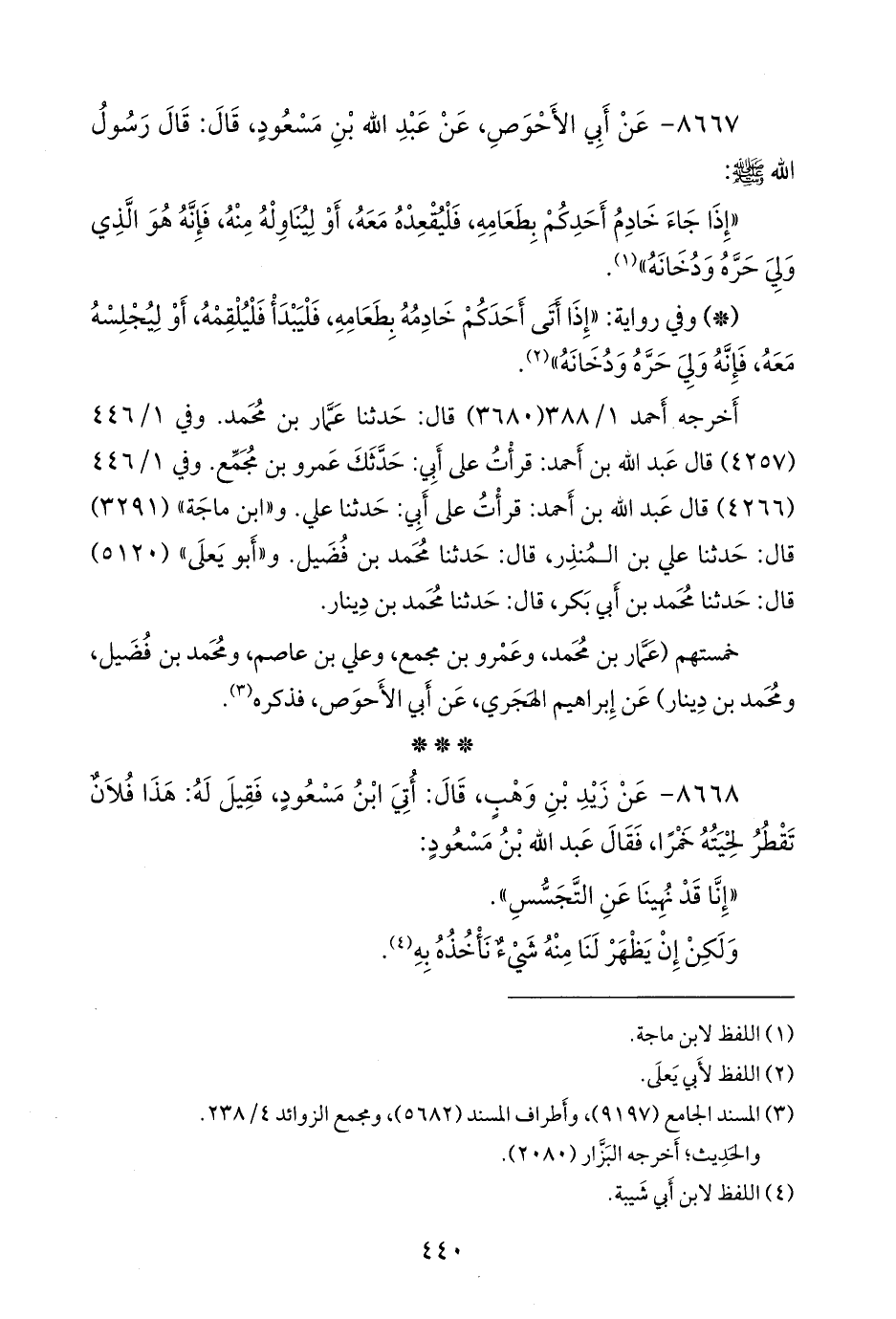 (¬٣) المسند الجامع (٩١٩٧)، وأطراف المسند (٥٦٨٢)، ومَجمَع الزوائد ٤/ ٢٣٨.