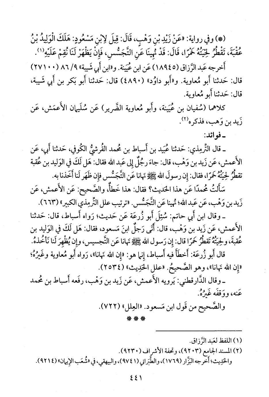 - وقال ابن أبي حاتم: سئل أَبو زُرعَة عن حديث؛ رواه أسباط، قال: حدثنا الأعمش، عن زيد بن وهب، قال: أتى رجل ابن مسعود، فقال: هل لك في الوليد بن عُقبة، ولحيته تقطر خمرا قال: إن رسول الله صَلى الله عَليه وسَلم نهانا عن التجسيس، وإن يظهر لنا نأخذه.