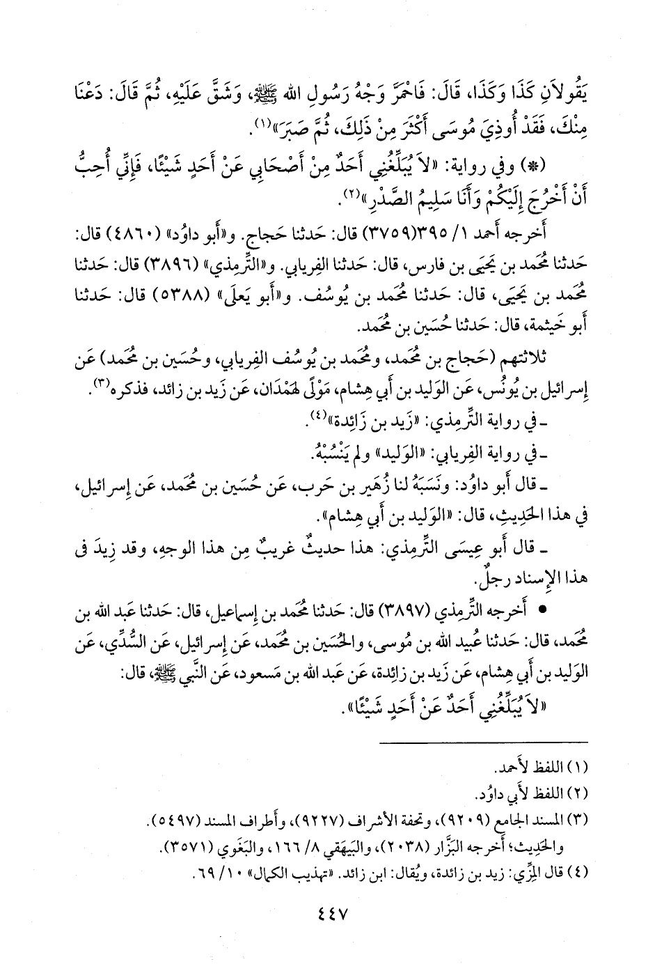 - أَخرجه التِّرمِذي (٣٨٩٧) قال: حدثنا محمد بن إسماعيل، قال: حدثنا عبد الله بن محمد، قال: حدثنا عُبيد الله بن موسى، والحسين بن محمد، عن إسرائيل، عن السُّدِّي، عن الوليد بن أبي هشام، عن زيد بن زائدة، عن عبد الله بن مسعود، عن النبي صَلى الله عَليه وسَلم قال: