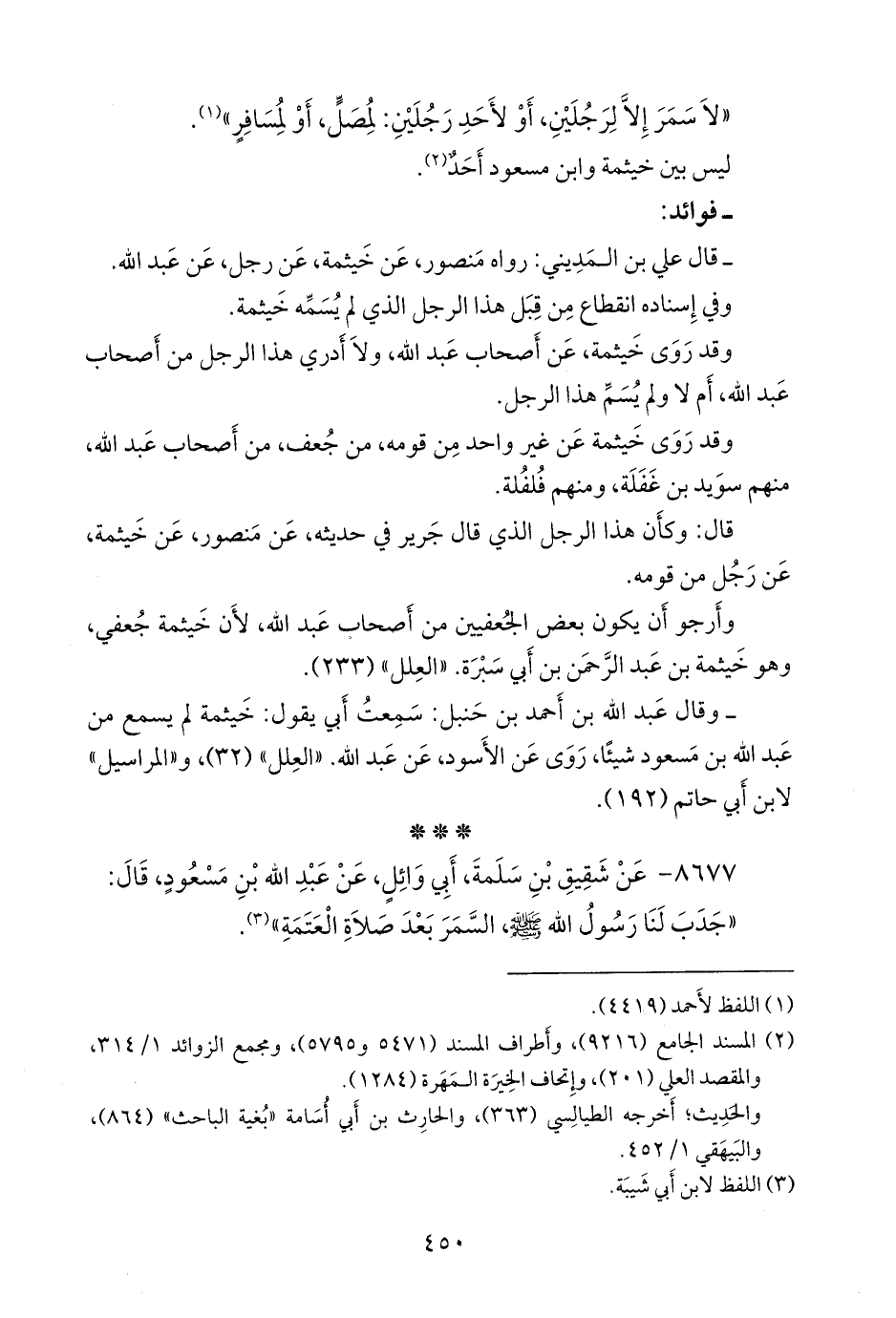 - وقال عبد الله بن أحمد بن حنبل: سمعت أبي يقول: خيثمة لم يسمع من عبد الله بن مسعود شيئا، روى عن الأسود، عن عبد الله. «العلل» (٣٢)، و «المراسيل» لابن أبي حاتم (١٩٢).