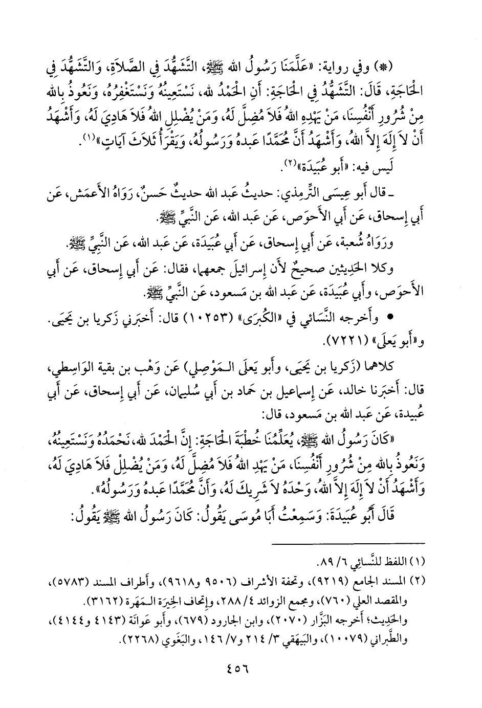 - وفي رواية: «علمنا رسول الله صَلى الله عَليه وسَلم التشهد في الصلاة، والتشهد في الحاجة، قال: التشهد في الحاجة: أن الحمد لله، نستعينه ونستغفره، ونعوذ بالله من شرور أنفسنا، من يهده الله فلا مضل له، ومن يضلل الله فلا هادي له، وأشهد أن لا إله إلا الله، وأشهد أن محمدا عبده ورسوله، ويقرأ ثلاث آيات» (¬١).