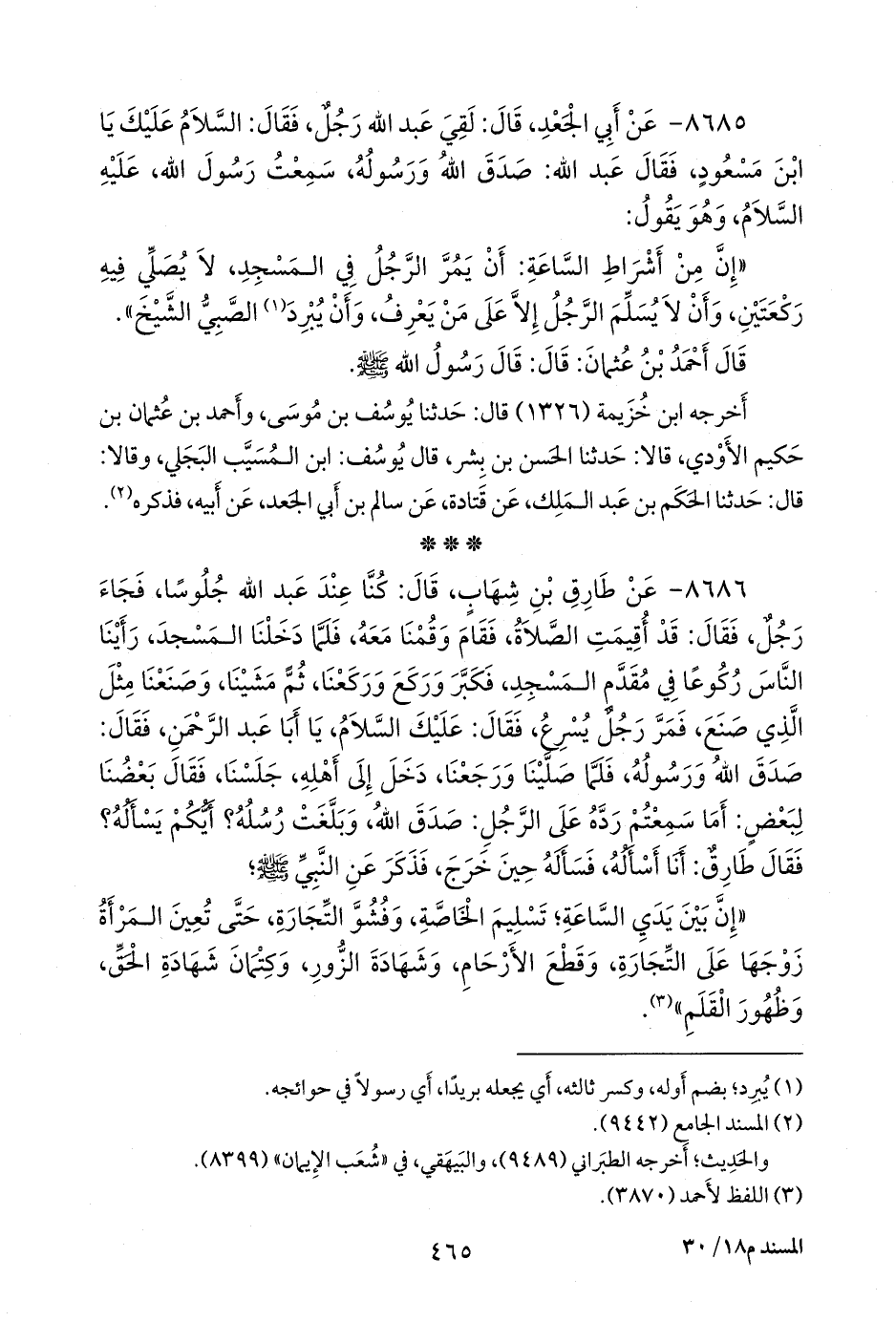 - وفي رواية: «عن طارق، عن عبد الله بن مسعود، قال له: يا أبا عبد الرَّحمَن، تسليم الرجل عليك، فقلت: صدق الله ورسوله؟ قال: فقال: قال رسول الله صَلى الله عَليه وسَلم: بين يدي الساعة: تسليم الخاصة، وتفشو التجارة، حتى تعين المرأة زوجها على التجارة، وتقطع الأرحام» (¬٢).