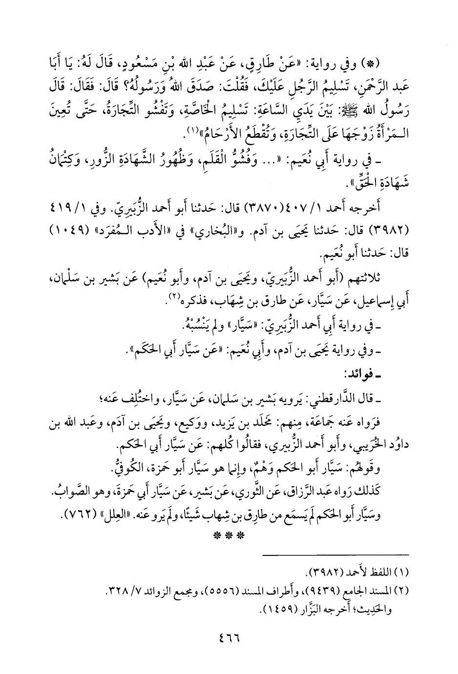 (¬٢) سيار؛ هو أَبو حمزة، كما قال الدارقُطني في الفوائد، وقال أحمد بن حنبل: وهو الصواب: «سيار أَبو حمزة» قال: وسيار أَبو الحكم لم يحدث عن طارق بن شهاب بشيء. «المسند» (٤٢١٩).
