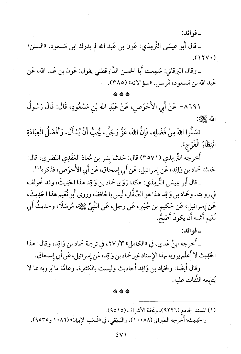 - قلنا: إِسناده ضعيفٌ؛ قال التِّرمِذي: عون بن عبد الله لم يدرك ابن مسعود. «السنن» (١٢٧٠).