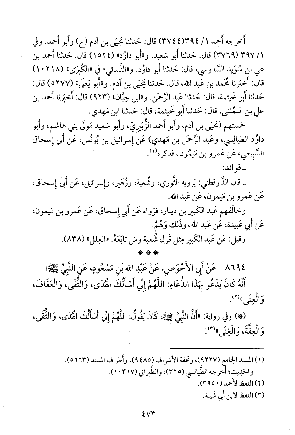 - وفي رواية: «أن النبي صَلى الله عَليه وسَلم كان يقول: اللهم إني أسألك الهدى، والتقى، والعفة، والغنى» (¬٢).