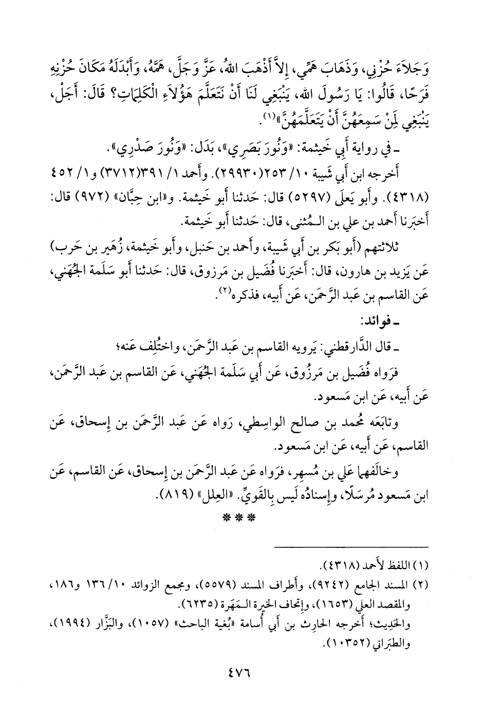 ـ في رواية أبي خيثمة: «ونور بصري»، بدل: «ونور صدري».