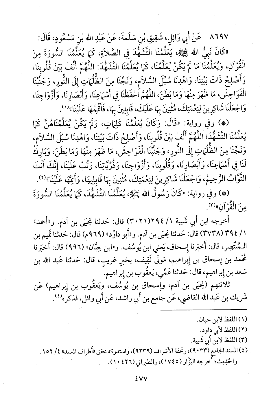 - وفي رواية: «قال: وكان يعلمنا كلمات، ولم يكن يعلمناهن كما يعلمنا التشهد؛ اللهم ألف بين قلوبنا، وأصلح ذات بيننا، واهدنا سبل السلام، ونجنا من الظلمات إلى النور، وجنبنا الفواحش، ما ظهر منها وما بطن، وبارك لنا في أسماعنا، وأبصارنا، وقلوبنا، وأزواجنا، وذرياتنا، وتب علينا، إنك أنت التواب الرحيم، واجعلنا شاكرين لنعمتك، مثنين بها قابليها، وأتمها علينا» (¬٢).