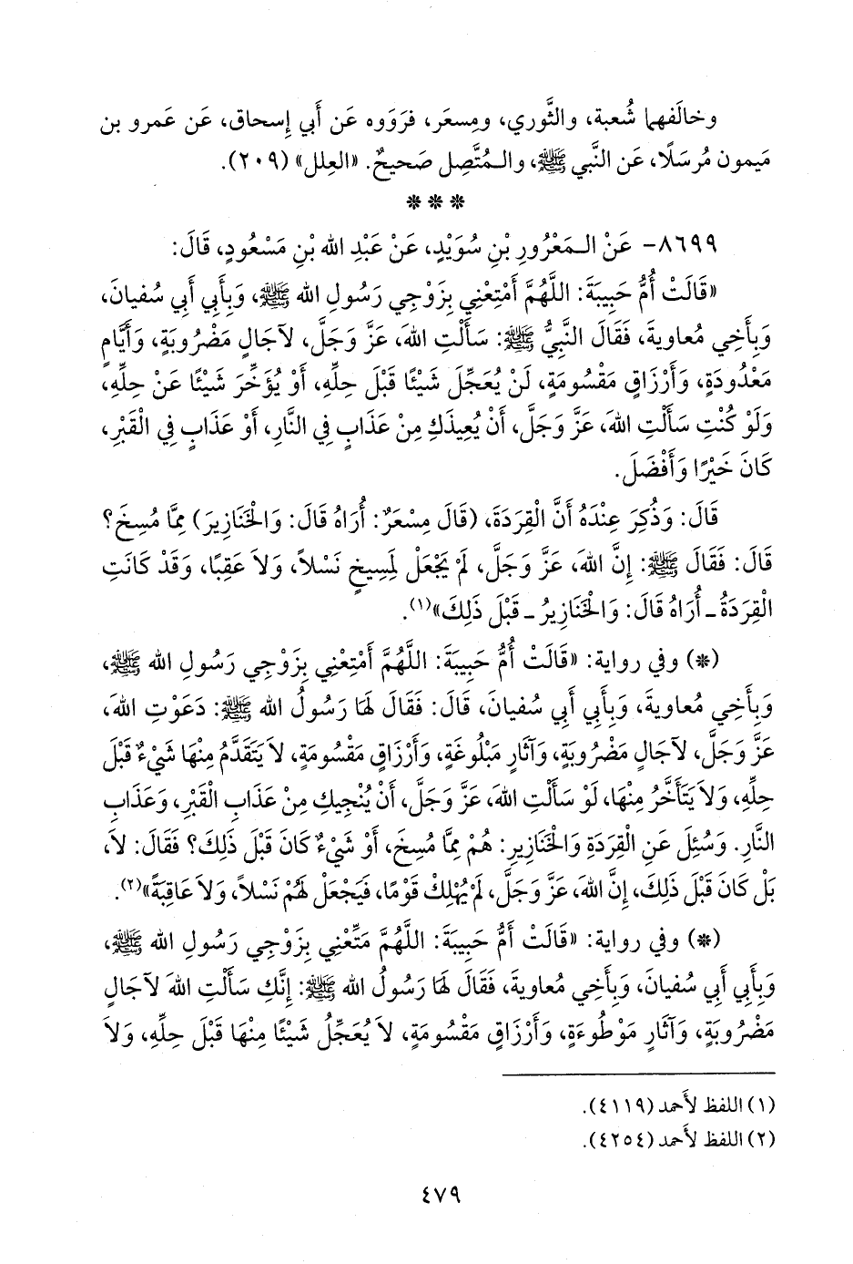 - وفي رواية: «قالت أم حبيبة: اللهم بارك لي في زوجي رسول الله صَلى الله عَليه وسَلم وبأبي أبي سفيان، وبأخي معاوية، فقال النبي صَلى الله عَليه وسَلم: لقد سألت الله عن آجال مضروبة، وأرزاق مقسومة، وآثار مبلوغة، لا يعجل منها شيء قبل حله، فلو سألت الله أن يعيذك من عذاب النار، أو عذابٍ القبر، كان خيرا، أو كان أفضل.