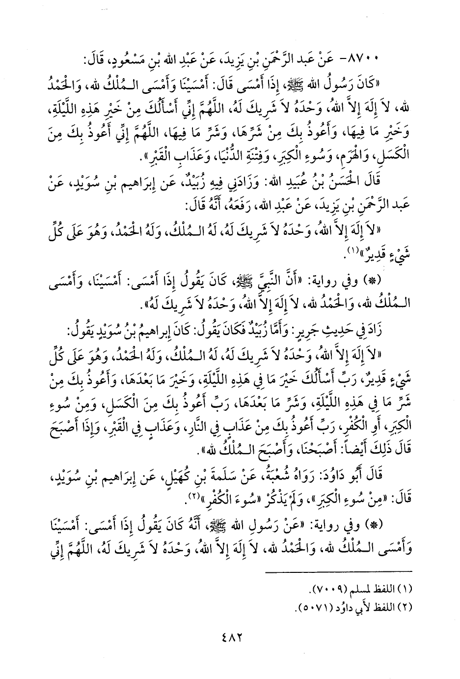 - وفي رواية: «عن رسول الله صَلى الله عَليه وسَلم أَنه كان يقول إِذا أَمسى: أَمسينا وأَمسى الملك لله والحمد، لا إِله إِلا الله، وحده لا شريك له، اللهم إِني