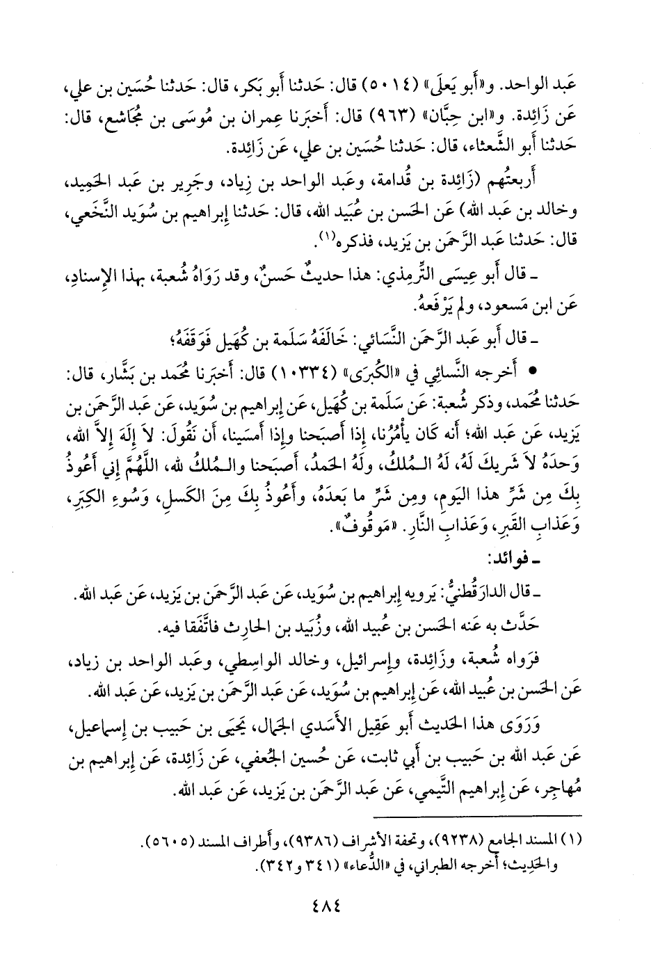 فرواه شعبة، وزائدة، وإسرائيل، وخالد الواسطي، وعبد الواحد بن زياد، عن الحسن بن عبيد الله، عن إبراهيم بن سويد، عن عبد الرَّحمَن بن يزيد، عن عبد الله.