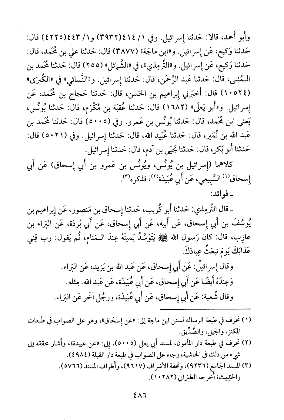 - قال التِّرمِذي: حدثنا أَبو كُريب، قال: حدثنا إسحاق بن منصور، عن إبراهيم بن يوسف بن أبي إسحاق، عن أبيه، عن أبي إسحاق، عن أبي بردة، عن البراء بن عازب، قال: كان رسول الله صَلى الله عَليه وسَلم يتوسد يمينه عند المنام، ثم يقول: رب قني عذابك يوم تبعث عبادك.