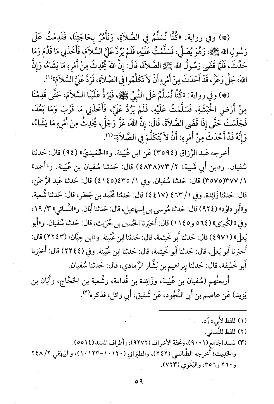 - وفي رواية: «كنا نسلم على النبي صَلى الله عَليه وسَلم فيرد علينا السلام، حتى قدمنا من أرض الحبشة، فسلمت عليه، فلم يرد علي، فأخذني ما قرب وما بعد، فجلست حتى إذا قضى الصلاة، قال: إن الله، عز وجل، يحدث من أمره ما يشاء، وإنه قد أحدث من أمره: أن لا يتكلم في الصلاة» (¬٢).