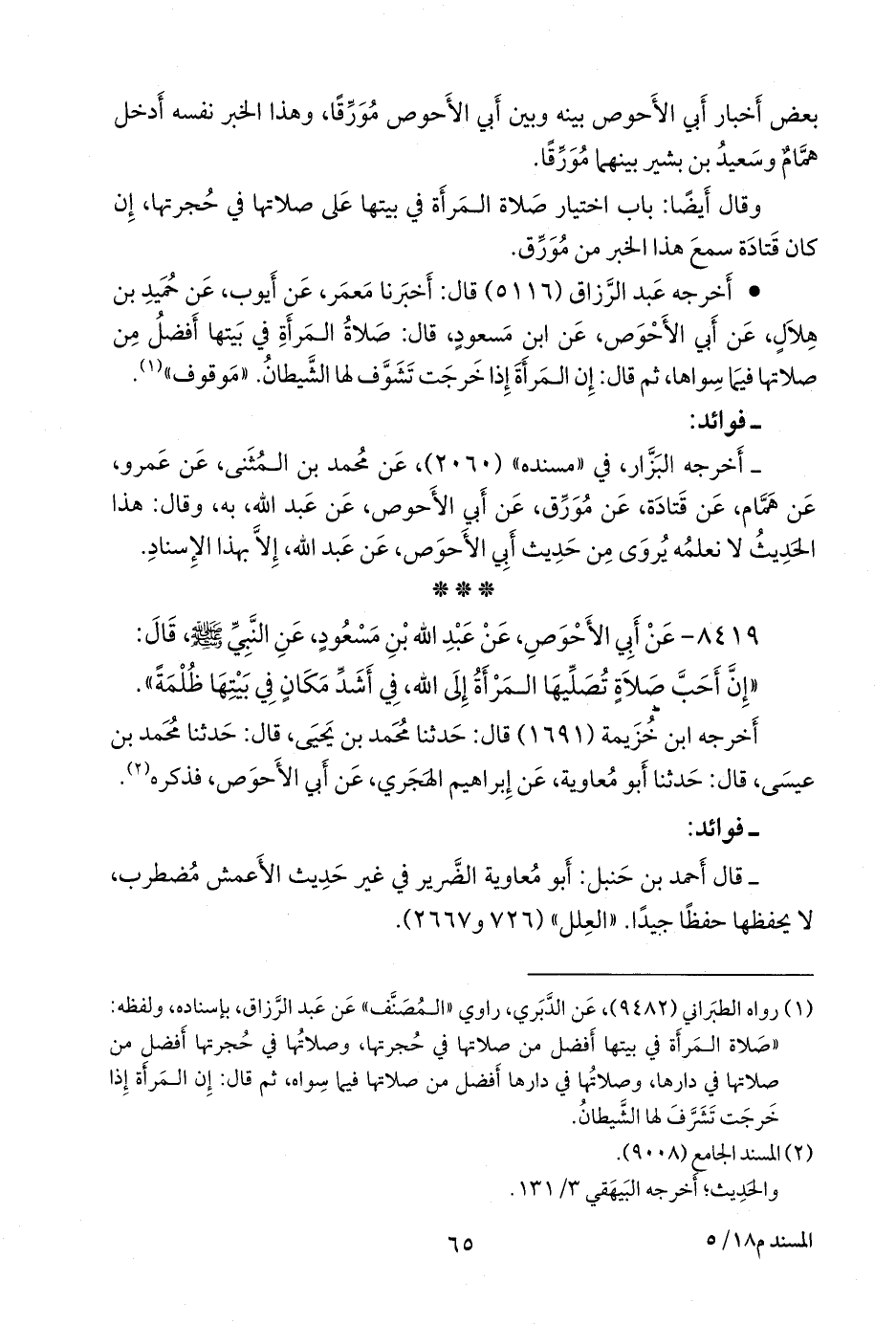 - أخرجه البزار في «مسنده» (٢٠٦٠)، عن محمد بن المثنى، عن عَمرو، عن همام، عن قتادة، عن مورق، عن أبي الأحوص، عن عبد الله، به، وقال: هذا الحديث لا نعلمه يروى من حديث أبي الأحوص، عن عبد الله، إلا بهذا الإسناد.