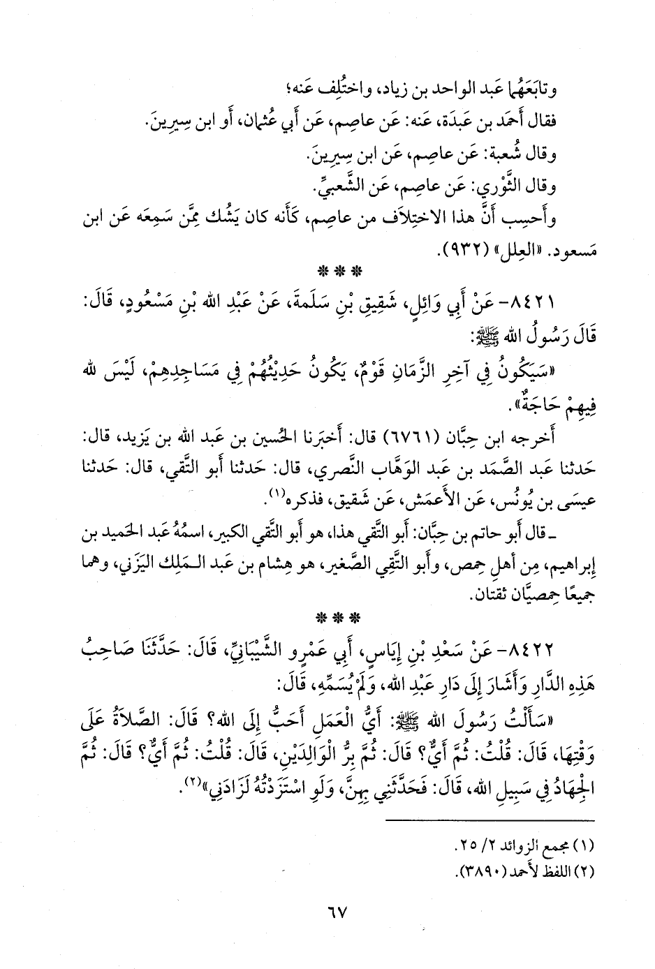 «سألت رسول الله صَلى الله عَليه وسَلم: أي العمل أحب إلى الله؟ قال: الصلاة على وقتها، قال: قلت: ثم أي؟ قال: ثم بر الوالدين، قال: قلت: ثم أي؟ قال: ثم الجهاد في سبيل الله، قال: فحدثني بهن، ولو استزدته لزادني» (¬١).