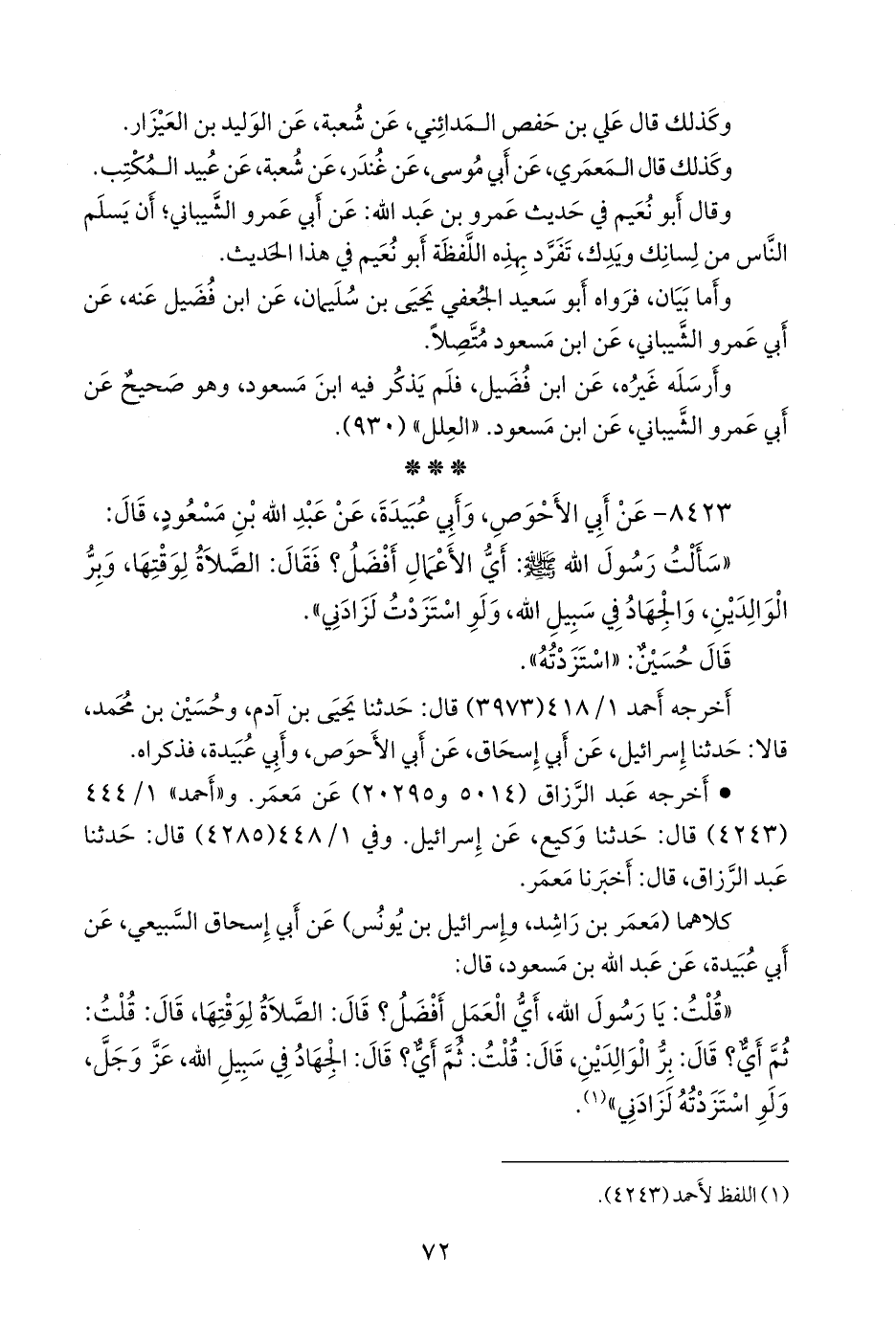 «قلت: يا رسول الله، أي العمل أفضل؟ قال: الصلاة لوقتها، قال: قلت: ثم أي؟ قال: بر الوالدين، قال: قلت: ثم أي؟ قال: الجهاد في سبيل الله، عز وجل، ولو استزدته لزادني» (¬١).