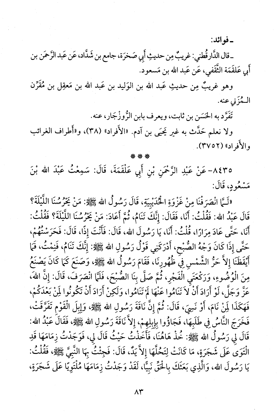 «لما انصرفنا من غزوة الحُدَيبيَة، قال رسول الله صَلى الله عَليه وسَلم: من يحرسنا الليلة؟ قال عبد الله: فقلت: أنا، فقال: إنك تنام، ثم أعاد: من يحرسنا الليلة؟ فقلت: أنا، حتى عاد مرارا، قلت: أنا، يا رسول الله، قال: فأنت إذا، قال: فحرستهم، حتى إذا كان وجه الصبح، أدركني قول رسول الله صَلى الله عَليه وسَلم: إنك تنام، فنمت، فما أيقظنا إلا حر الشمس في ظهورنا، فقام رسول الله صَلى الله عَليه وسَلم وصنع كما كان يصنع من الوضوء، وركعتي الفجر، ثم صلى بنا الصبح، فلما انصرف، قال: إن الله، عز وجل، لو أراد أن لا تناموا عنها لم تناموا، ولكن أراد أن تكونوا لمن بعدكم، فهكذا لمن نام، أو نسي، قال: ثم إن ناقة رسول الله صَلى الله عَليه وسَلم وإبل القوم تفرقت، فخرج الناس في طلبها، فجاؤوا بإبلهم، إلا ناقة رسول الله صَلى الله عَليه وسَلم فقال عبد الله: قال لي رسول الله صَلى الله عَليه وسَلم: خذ هاهنا، فأخذت حيث قال لي، فوجدت زمامها قد التوى على شجرة، ما كانت لتحلها إلا يد، قال: فجئت بها النبي صَلى الله عَليه وسَلم فقلت: يا رسول الله، والذي بعثك بالحق نبيا، لقد وجدت زمامها ملتويا على شجرة،