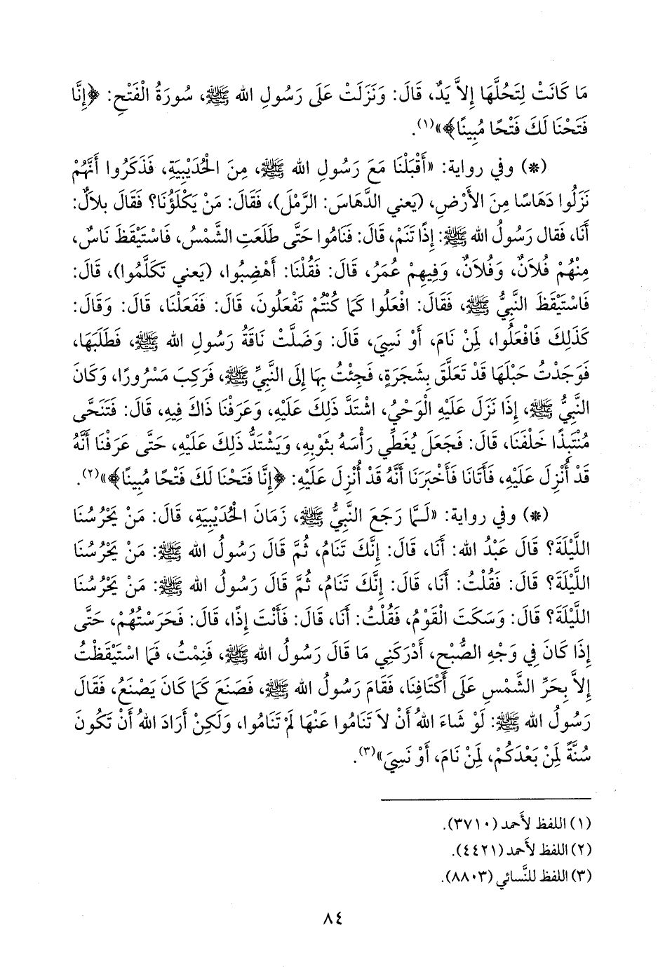 - وفي رواية: «أقبلنا مع رسول الله صَلى الله عَليه وسَلم من الحُدَيبيَة، فذكروا أنهم نزلوا دهاسا من الأرض، (يعني الدهاس: الرمل)، فقال: من يكلؤنا؟ فقال بلال: أنا، فقال رسول الله صَلى الله عَليه وسَلم: إذا تنم، قال: فناموا حتى طلعت الشمس، فاستيقظ ناس، منهم فلان، وفلان، وفيهم عمر، قال: فقلنا: أهضبوا، (يعني تكلموا)، قال: فاستيقظ النبي صَلى الله عَليه وسَلم فقال: افعلوا كما كنتم تفعلون، قال: ففعلنا، قال: وقال: كذلك فافعلوا، لمن نام، أو نسي، قال: وضلت ناقة رسول الله صَلى الله عَليه وسَلم فطلبها، فوجدت حبلها قد تعلق بشجرة، فجئت بها إلى النبي صَلى الله عَليه وسَلم فركب مسرورا، وكان النبي صَلى الله عَليه وسَلم إذا نزل عليه الوحي، اشتد ذلك عليه، وعرفنا ذاك فيه، قال: فتنحى منتبذا خلفنا، قال: فجعل يغطي رأسه بثوبه، ويشتد ذلك عليه، حتى عرفنا أنه قد أنزل عليه، فأتانا فأخبرنا أنه قد أنزل عليه: {إنا فتحنا لك فتحا مبينا}» (¬١).