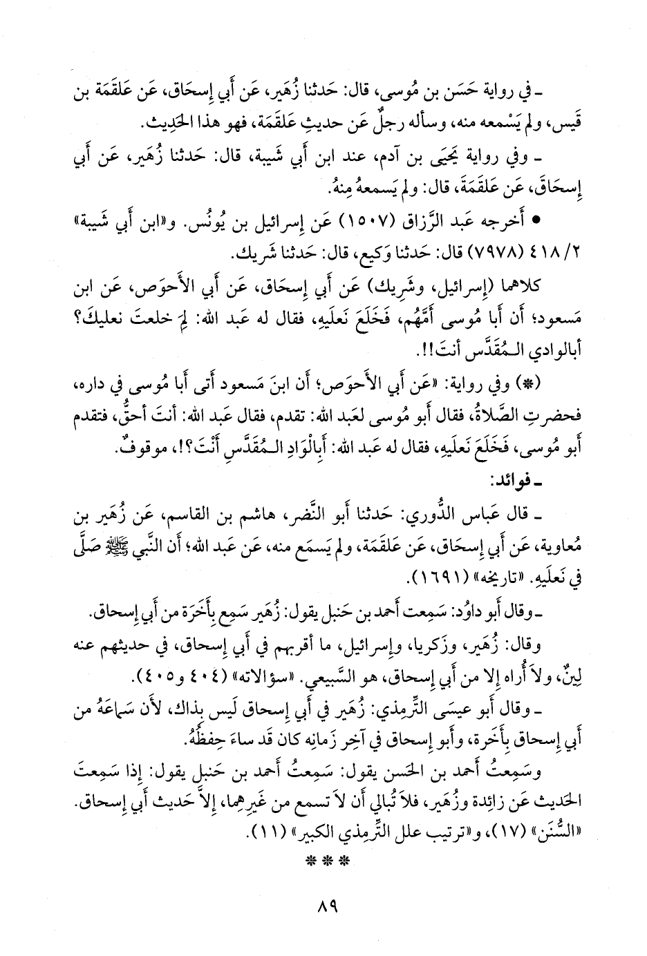 - قال عباس الدوري: حدثنا أَبو النضر هاشم بن القاسم، عن زهير بن معاوية، عن أبي إسحاق، عن علقمة، ولم يسمع منه، عن عبد الله؛ أن النبي صَلى الله عَليه وسَلم صلى في نعليه. «تاريخه» (١٦٩١).