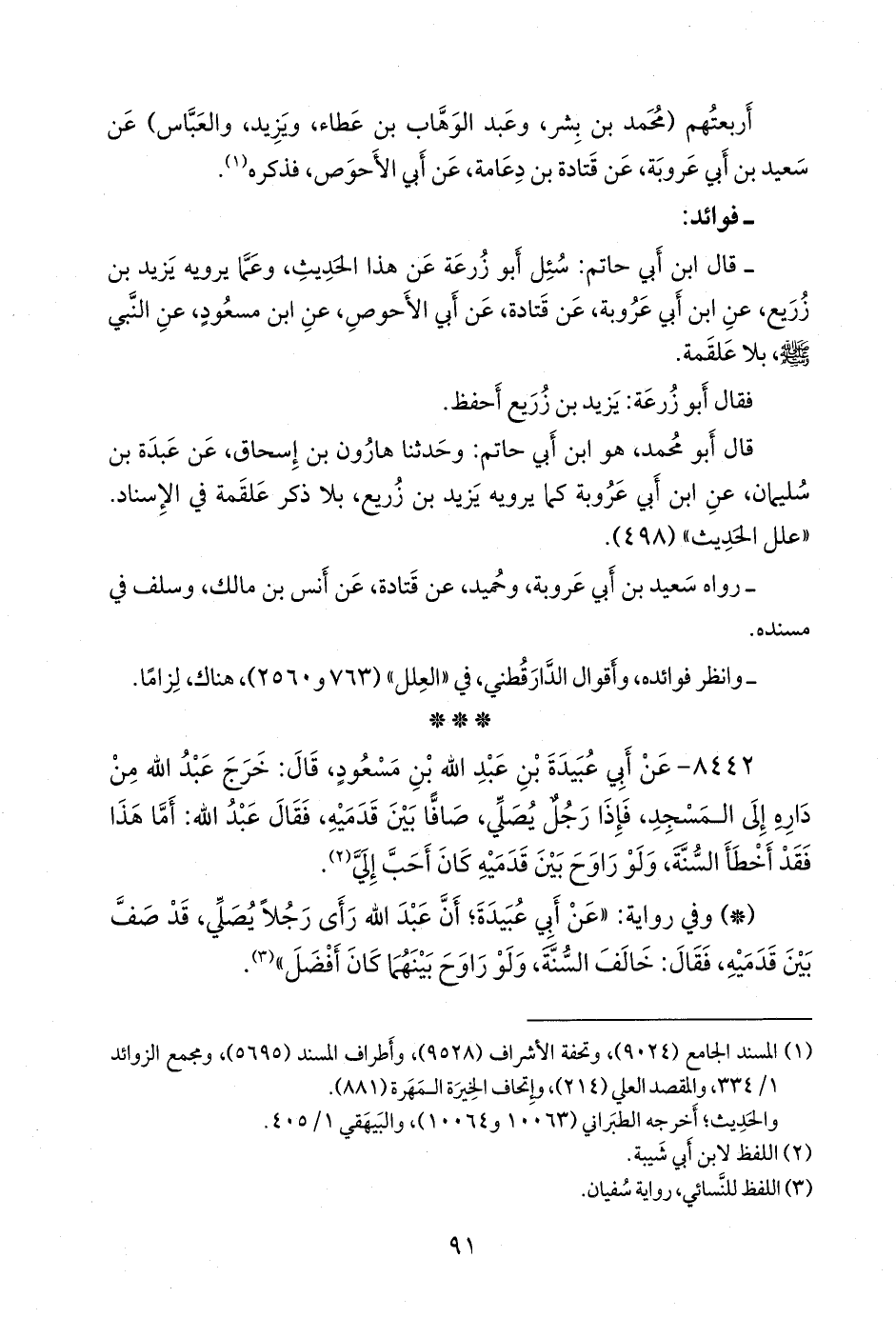 - قال عبد الرَّحمَن بن أبي حاتم الرازي: سئل أَبو زُرعَة عن هذا الحديث، وعما يرويه يزيد بن زُريع، عن ابن أبي عَروبَة، عن قتادة، عن أبي الأحوص، عن ابن مسعود، عن النبي صَلى الله عَليه وسَلم بلا علقمة.