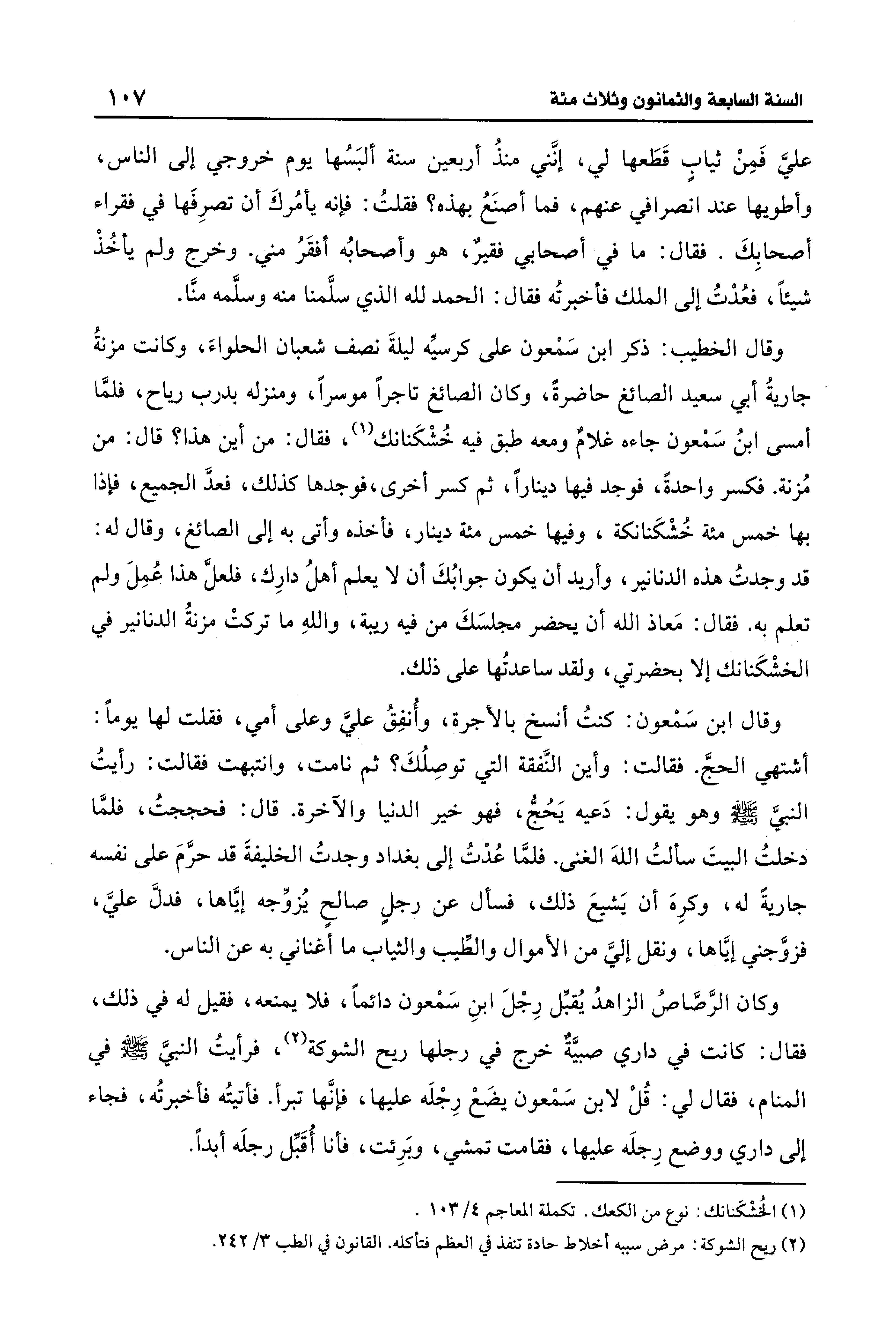 وقال الخطيب: ذكر ابن سَمْعون على كرسيِّه ليلةَ نصف شعبان الحلواءَ، وكانت مزنةُ جاريةُ أبي سعيد الصائغ حاضرةً، وكان الصائغ تاجرًا موسرًا، ومنزله بدرب رياح، فلمَّا أمسى ابنُ سَمعون جاءه غلامٌ ومعه طبق فيه خُشْكَنانك (¬1)، فقال: من أين هذا؟ قال: من مُزنة. فكسر واحدةً، فوجد فيها دينارًا، ثم كسر أخرى، فوجدها كذلك، فعدَّ الجميع، فإذا بها خمس مئة خُشْكَنانكة، وفيها خمس مئة دينار، فأخذه وأتى به إلى الصائغ، وقال له: قد وجدتُ هذه الدنانير، وأريد أن يكون جوابُكَ أن لا يعلم أهلُ دارِك، فلعلَّ هذا عُمِلَ ولم تعلم به. فقال: مَعاذ الله أن يحضر مجلسَكَ من فيه ريبة، واللهِ ما تركتْ مزنةُ الدنانير في الخشْكَنانك إلا بحضرتي، ولقد ساعدتُها على ذلك.