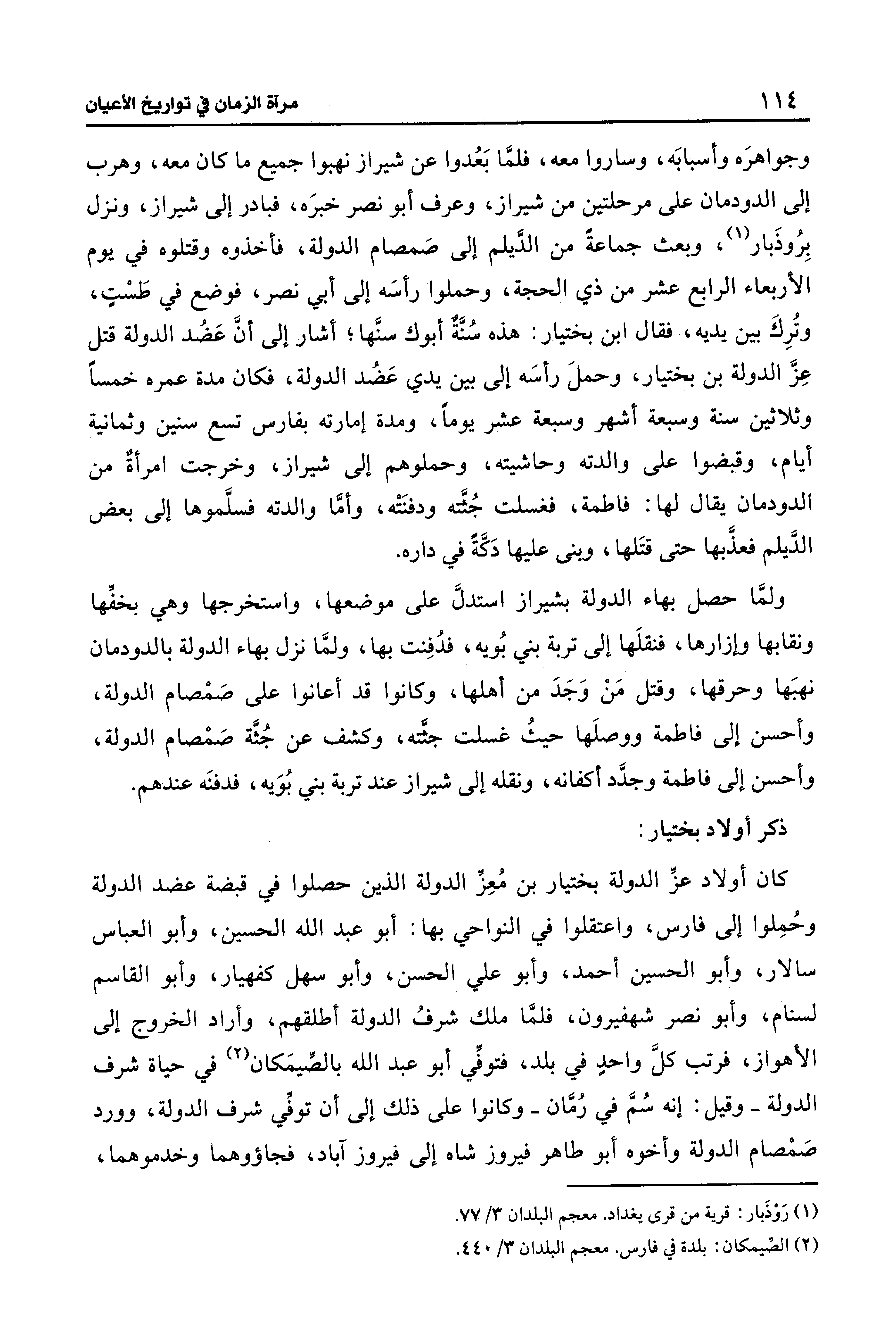 كان أولاد عزِّ الدولة بختيار بن مُعِزّ الدولة الذين حصلوا في قبضة عضد الدولة وحُمِلوا إلى فارس، واعتقلوا في النواحي بها: أبو عبد الله الحسين، وأبو العباس سالار، وأبو الحسين أحمد، وأبو علي الحسن، وأبو سهل كفهيار، وأبو القاسم لسنام، وأبو نصر شهفيرون، فلمَّا ملك شرف الدولة أطلقهم، وأراد الخروج إلى الأهواز، فرتب كل واحد في بلد، فتوفّي أبو عبد الله بالصِّيمَكان (¬2) في حياة شرف الدولة -وقيل: إنه سُمَّ في رُمَّان- وكانوا على ذلك إلى أن توفّي شرف الدولة، وورد صَمصام الدولة وأخوه أبو طاهر فيروز شاه إلى فيروز آباد، فجاؤوهما وخدموهما،