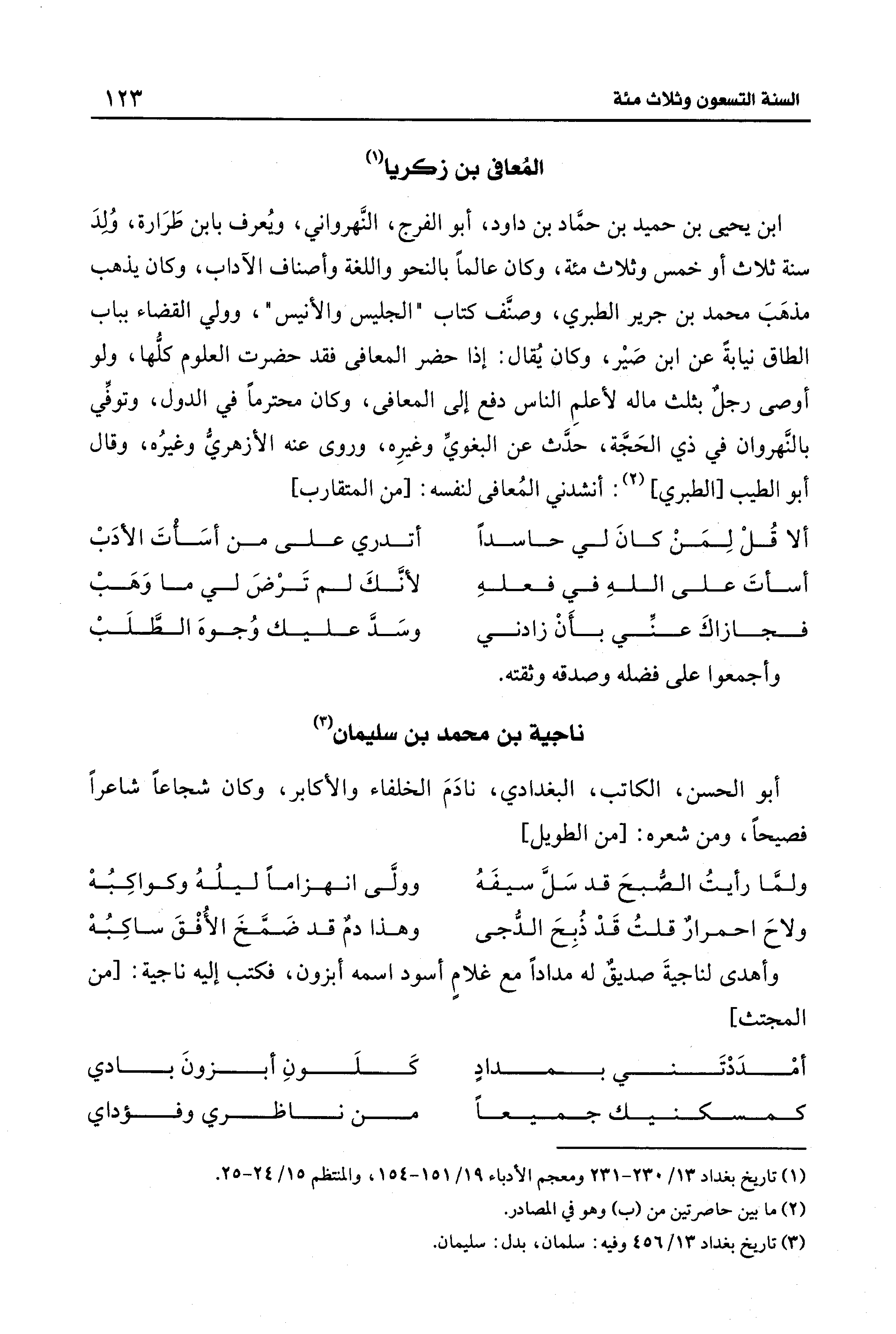 ابن يحيى بن حميد بن حمَّاد بن داود، أبو الفرج، النَّهرواني، ويعرف بابن طَرَارة، وُلدَ سنة ثلاث أو خمس وثلاث مئة، وكان عالمًا بالنحو واللغة وأصناف الآداب، وكان يذهب مذهبَ محمد بن جرير الطبري، وصنَّف كتاب "الجليس والأنيس"، وولي القضاء بباب الطاق نيابةً عن ابن صَير، وكان يُقال: إذا حضر المعافى فقد حضرت العلوم كلُّها، ولو أوصى رجلٌ بثلث ماله لأعلمِ الناس دفع إلى المعافى، وكان محترمًا في الدول، وتوفي بالنَّهروان في ذي الحَجَّة، حدَّث عن البغويِّ وغيرِه، وروى عنه الأزهريُّ وغيرُه، وقال أبو الطيب [الطبري] (¬2): أنشدني المُعافي لنفسه: [من المتقارب]