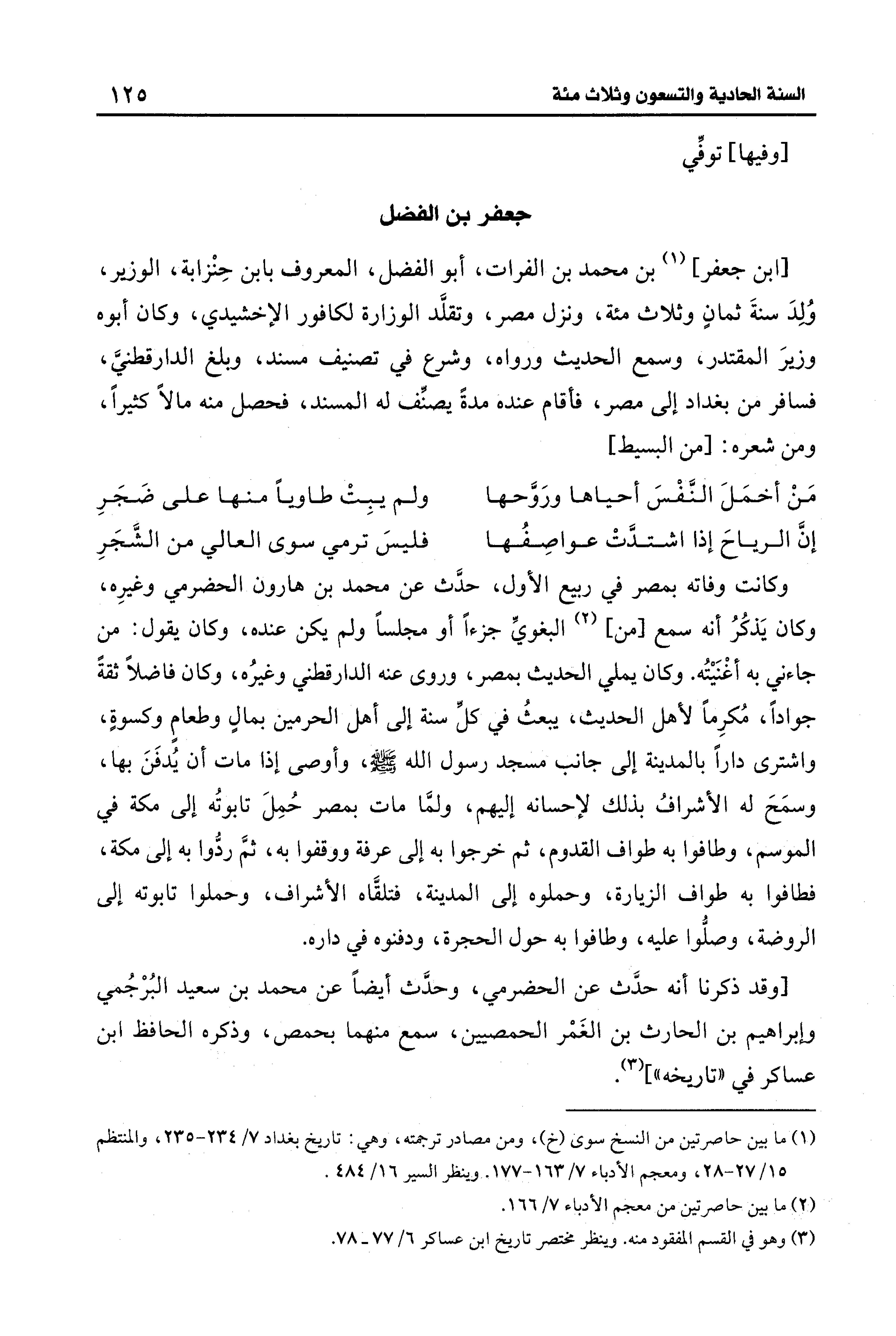 وكانت وفاته بمصر في ربيع الأول، حدَّث عن محمد بن هارون الحضرمي وغيرِه، وكان يَذكُرُ أنه سمع [من] (¬2) البغويِّ جزءًا أو مجلسًا ولم يكن عنده، وكان يقول: من جاءني به أغْنَيتُه. وكان يملي الحديث بمصر، وروى عنه الدارقطني وغيرُه، وكان فاضلًا ثقةً جوادًا، مُكرِمًا لأهل الحديث، يبعثُ في كلِّ سنة إلى أهل الحرمين بمالٍ وطعامٍ وكسوةٍ، واشترى دارًا بالمدينة إلى جانب مسجد رسول الله - صلى الله عليه وسلم -، وأوصى إذا مات أن يُدفَنَ بها، وسمَحَ له الأشرافُ بذلك لإحسانه إليهم، ولمَّا مات بمصر حُمِلَ تابوتُه إلى مكة في الموسم، وطافوا به طواف القدوم، ثم خرجوا به إلى عرفة ووقفوا به، ثمَّ ردُّوا به إلى مكة، فطافوا به طواف الزيارة، وحملوه إلى المدينة، فتلقَّاه الأشراف، وحملوا تابوته إلى الروضة، وصلّوا عليه، وطافوا به حول الحجرة، ودفنوه في داره.