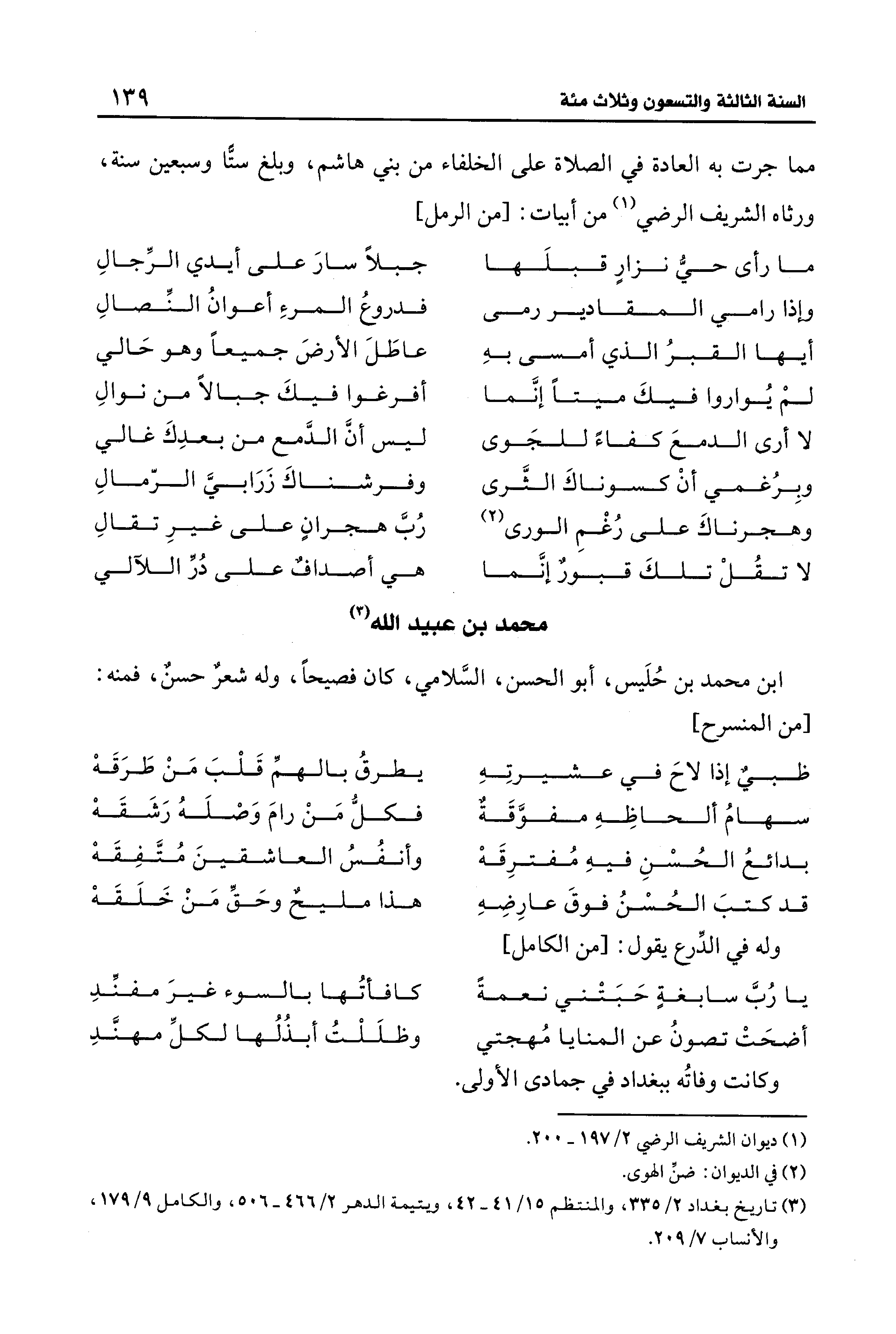 مما جرت به العادة في الصلاة على الخلفاء من بني هاشم، وبلغ ستًّا وسبعين سنة، ورثاه الشريف الرضي (¬1) من أبيات: [من الرمل]