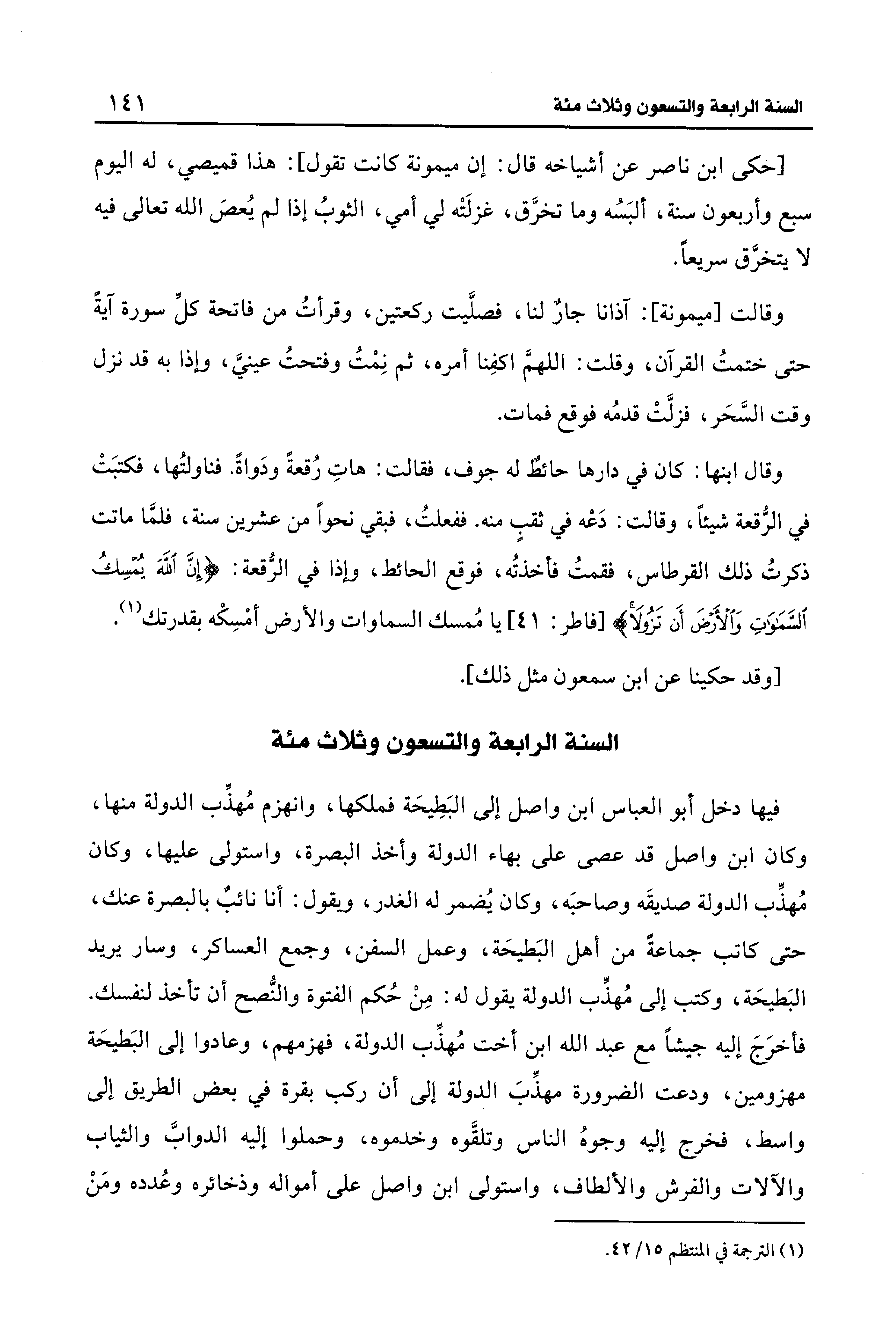 [حكى ابن ناصر عن أشياخه قال: إن ميمونة كانت تقول]: هذا قميصي، له اليوم سبع وأربعون سنة، ألبَسُه وما تخرَّق، غزلَتْه في أمي، الثوبُ إذا لم يُعصَ الله تعالى فيه لا يتخرَّق سريعًا.