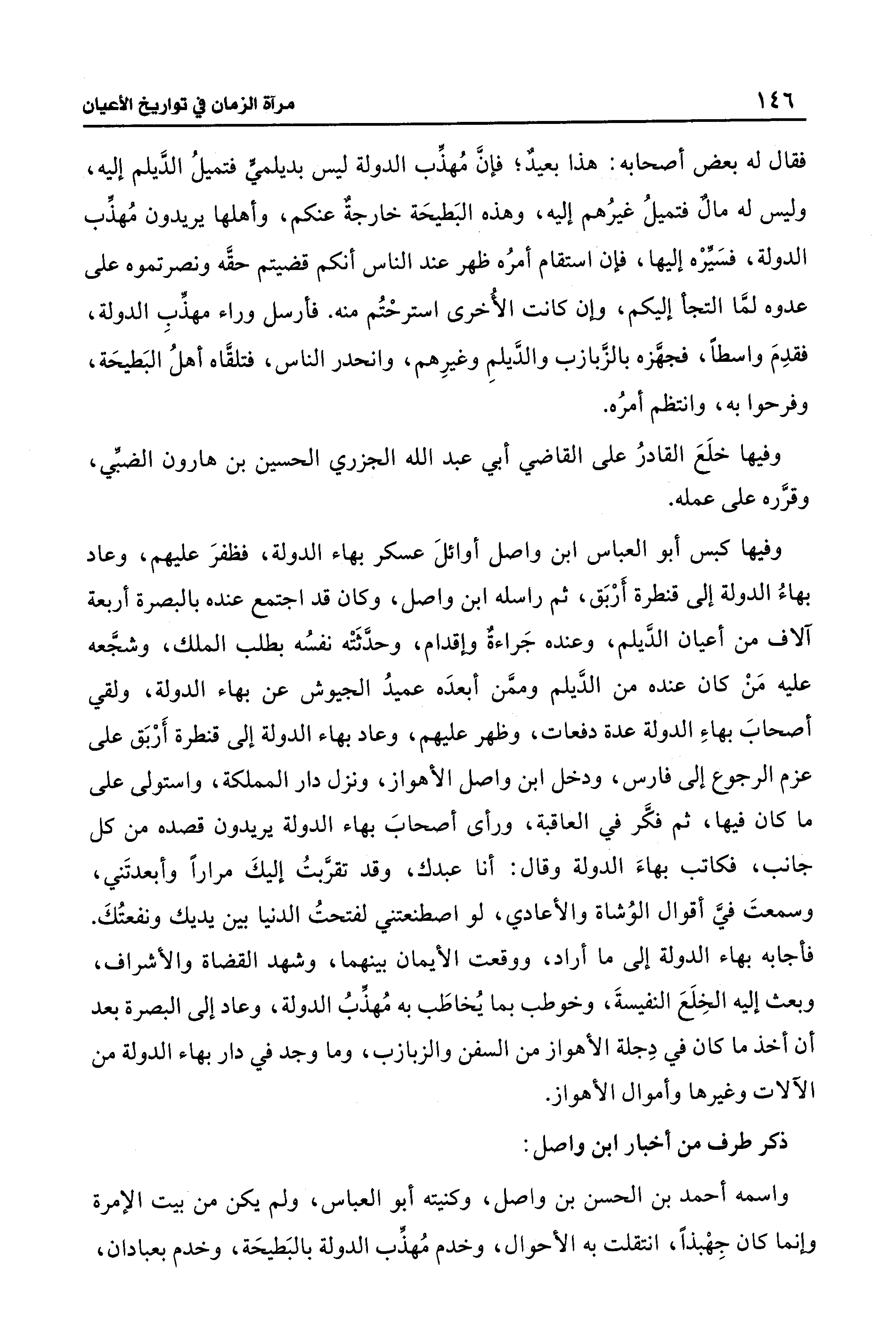 وفيها كبس أبو العباس بن واصل أوائلَ عسكر بهاء الدولة، فظفرَ عليهم، وعاد بهاءُ الدولة إلى قنطرة أَرْبَق، ثم راسله ابن واصل، وكان قد اجتمع عنده بالبصرة أربعة آلاف من أعيان الدَّيلم، وعنده جَراءةٌ وإقدام، وحدَّثَتْه نفسُه بطلب الملك، وشجَّعه عليه مَنْ كان عنده من الدَّيلم وممَّن أبعدَه عميدُ الجيوش عن بهاء الدولة، ولقي أصحابَ بهاءِ الدولة عدة دفعات، وظهر عليهم، وعاد بهاء الدولة إلى قنطرة أَرْبَق على عزم الرجوع إلى فارس، ودخل ابن واصل الأهواز، ونزل دار المملكة، واستولى على ما كان فيها، ثم فكَّر في العاقبة، ورأى أصحابَ بهاء الدولة يريدون قصده من كل جانب، فكاتب بهاءَ الدولة وقال: أنا عبدك، وقد تقرَّبتُ إليكَ مراراً وأبعدتَني، وسمعتَ فيَّ أقوال الوُشاة والأعادي، لو اصطنعتني لفتحتُ الدنيا بين يديك ونفعتُكَ. فأجابه بهاء الدولة إلى ما أراد، ووقعت الأيمان بينهما، وشهد القضاة والأشراف، وبعث إليه الخِلَعَ النفيسةَ، وخوطب بما يُخاطَب به مُهذِّبُ الدولة، وعاد إلى البصرة بعد أن أخذ ما كان في دِجلة الأهواز من السفن والزبازب، وما وجد في دار بهاء الدولة من الآلات وغيرها وأموال الأهواز.