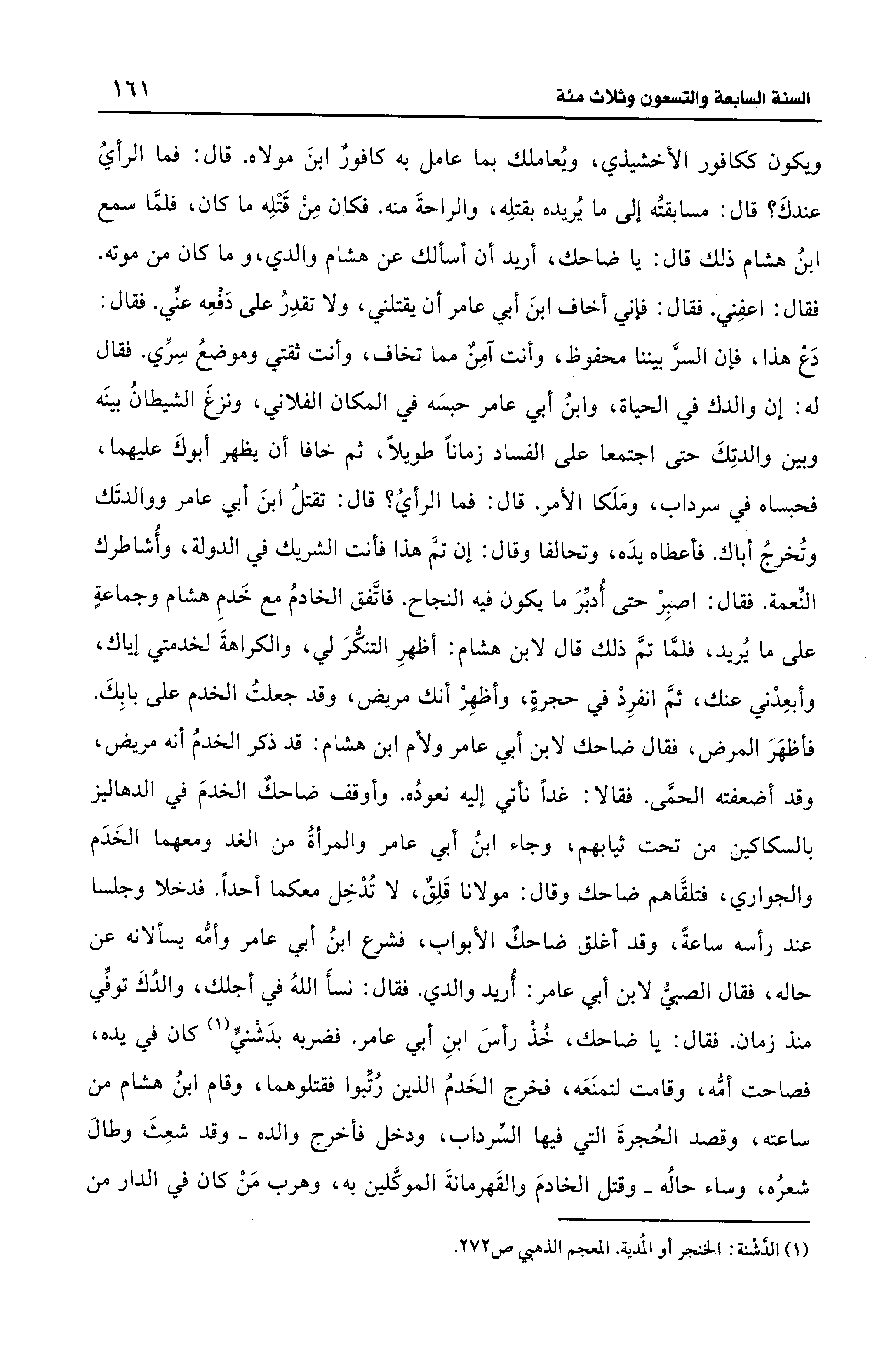 ويكون ككافور الأخشيذي، ويُعاملك بما عامل به كافورٌ ابنَ مولاه. قال: فما الرأيُ عندكَ؟ قال: مسابقتُه إلى ما يُريده بقتلِه، والراحةَ منه. فكان مِنْ قَتْلِه ما كان، فلمَّا سمع ابنُ هشام ذلك قال: يا ضاحك، أريد أن أسألك عن هشام والدي، وما كان من موته. فقال: اعفِني. فقال: فإني أخاف ابنَ أبي عامر أن يقتلني، ولا تقدِرُ على دَفْعِه عنِّي. فقال: دَعْ هذا، فإن السرَّ بيننا محفوظ، وأنت آمِنٌ مما تخاف، وأنت ثقتي وموضعُ سِرِّي. فقال له: إن والدك في الحياة، وابنُ أبي عامر حبسَه في المكان الفلاني، ونزغَ الشيطانُ بينَه وبين والدتِكَ حتى اجتمعا على الفساد زمانًا طويلًا، ثمَّ خافا أن يظهر أبوكَ عليهما، فحبساه في سرداب، ومَلَكا الأمر. قال: فما الرأيُ؟ قال: تقتلُ ابنَ أبي عامر ووالدتَك وتُخرجُ أباك. فأعطاه يدَه، وتحالفا وقال: إن تمَّ هذا فأنت الشريك في الدولة، وأُشاطرك النِّعمة. فقال: اصبِرْ حتى أُدبِّرَ ما يكون فيه النجاح. فاتَّفق الخادمُ مع خَدمِ هشام وجماعةٍ على ما يُريد، فلمَّا تمَّ ذلك قال لابن هشام: أظهرِ التنكُّرَ لي، والكراهةَ لخدمتي إياك، وأبعِدْني عنك، ثمَّ انفرِدْ في حجرةٍ، وأظهِرْ أنك مريض، وقد جعلتُ الخدم على بابِكَ. فأظهَرَ المرض، فقال ضاحك لابن أبي عامر ولأم ابن هشام: قد ذكر الخدمُ أنَّه مريض، وقد أضعفته الحمَّى. فقالا: غدًا نأتي إليه نعودُه. وأوقف ضاحكٌ الخدمَ في الدهاليز بالسكاكين من تحت ثيابهم، وجاء ابنُ أبي عامر والمرأةُ من الغد ومعهما الخَدَم والجواري، فتلقَّاهم ضاحك وقال: مولانا قَلِقٌ، لا تُدْخِل معكما أحدًا. فدخلا وجلسا عند رأسه ساعةً، وقد أغلق ضاحكٌ الأبواب، فشرع ابنُ أبي عامر وأمُّه يسألانه عن حاله، فقال الصبيُّ لابن أبي عامر: أُريد والدي. فقال: نسأَ اللهُ في أجلك، والدُكَ توفِّي منذ زمان. فقال: يا ضاحك، خُذْ رأسَ ابنِ أبي عامر. فضربه بدَشْنيٍّ (¬1) كان في يده، فصاحت أمُّه، وقامت لتمنَعَه، فخرج الخَدمُ الذين رُتِّبوا فقتلوهما، وقام ابنُ هشام من ساعته، وقصد الحُجرةَ التي فيها السِّرداب، ودخل فأخرج والده - وقد شعِثَ وطال شعرُه، وساء حالُه - وقتل الخادمَ والقَهرمانةَ الموكَّلين به، وهرب مَنْ كان في الدار من