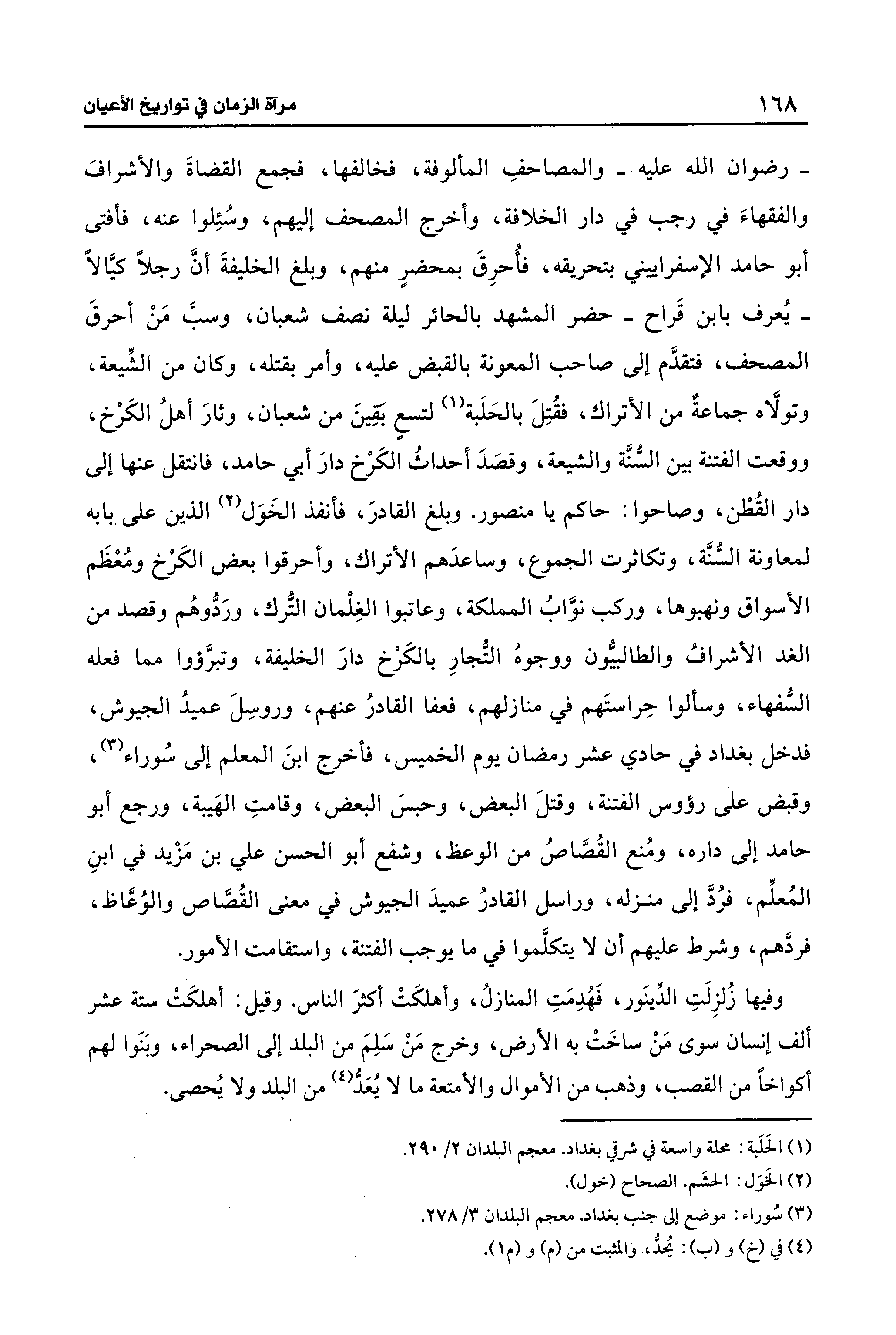 - رضوان الله عليه - والمصاحفِ المألوفة، فخالفها، فجمع القضاةَ والأشرافَ والفقهاءَ في رجب في دار الخلافة، وأخرج المصحف إليهم، وسُئِلوا عنه، فأفتى أبو حامد الإسفراييني بتحريقه، فأُحرِقَ بمحضرٍ منهم، وبلغ الخليفةَ أنَّ رجلًا كيَّالًا - يُعرف بابن قَراح - حضر المشهد بالحائر ليلة نصف شعبان، وسبَّ مَنْ أحرقَ المصحف، فتقدَّم إلى صاحب المعونة بالقبض عليه، وأمر بقتله، وكان من الشِّيعة، وتولَّاه جماعةٌ من الأتراك، فقُتِلَ بالحَلَبة (¬1) لتسعٍ بَقِينَ من شعبان، وثارَ أهلُ الكَرْخ، ووقعت الفتنة بين السُّنَّة والشيعة، وقصَدَ أحداثُ الكَرْخ دارَ أبي حامد، فانتقل عنها إلى دار القُطْن، وصاحوا: حاكم يا منصور. وبلغ القادرَ، فأنفذ الخَوَل (¬2) الذين على بابه لمعاونة السُّنَّة، وتكاثرت الجموع، وساعدَهم الأتراك، وأحرقوا بعض الكَرْخ ومُعْظَم الأسواق ونهبوها، وركب نوَّابُ المملكة، وعاتبوا الغِلْمان التُّرك، ورَدُّوهُم وقصد من الغد الأشرافُ والطالبيُّون ووجوهُ التُّجارِ بالكَرْخ دارَ الخليفة، وتبرَّؤوا مما فعله السُّفهاء، وسألوا حِراستَهم في منازلهم، فعفا القادرُ عنهم، وروسِلَ عميدُ الجيوش، فدخل بغداد في حادي عشر رمضان يوم الخميس، فأخرج ابنَ المعلم إلى سُوراء (¬3)، وقبض على رؤوس الفتنة، وقتلَ البعض، وحبسَ البعض، وقامتِ الهَيبة، ورجع أبو حامد إلى داره، ومُنع القُصَّاصُ من الوعظ، وشفع أبو الحسن علي بن مَزْيد في ابنِ المُعلِّم، فرُدَّ إلى منزله، وراسل القادرُ عميدَ الجيوش في معنى القُصَّاص والوُعَّاظ، فردَّهم، وشرط عليهم أن لا يتكلَّموا في ما يوجب الفتنة، واستقامت الأمور.