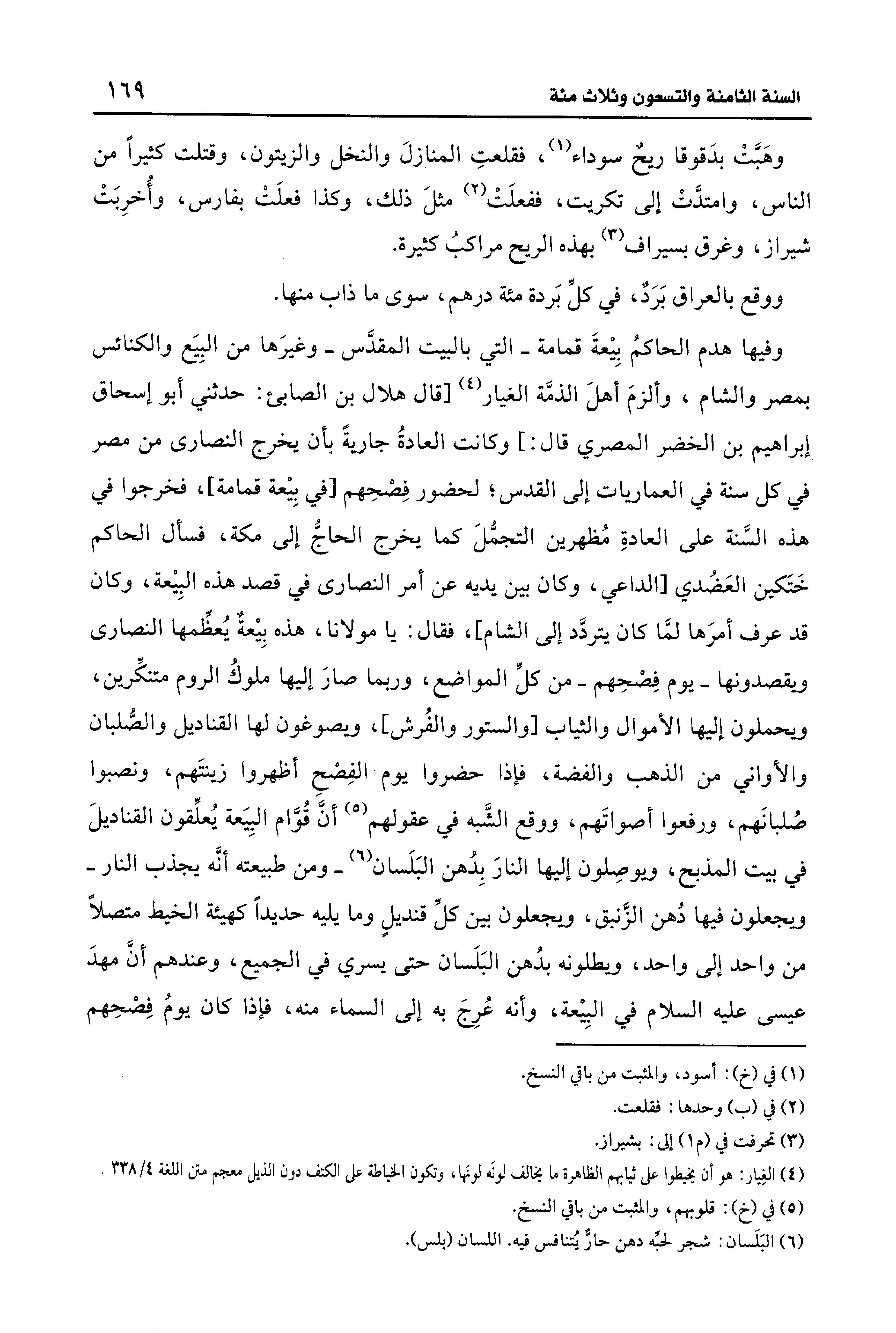 وفيها هدم الحاكمُ بِيعةَ قمامة - التي بالبيت المقدَّس - وغيرَها من البِيَع والكنائس بمصر والشام، وألزمَ أهلَ الذمَّة الغيار (¬4) [قال هلال بن الصابئ: حدثني أبو إسحاق إبراهيم بن الخضر المصري قال: ] وكانت العادةُ جاريةً بأن يخرج النصارى من مصر في كل سنة في العماريات إلى القدس؛ لحضور فِصْحِهم [في بِيعة قمامة]، فخرجوا في هذه السَّنة على العادةِ مُظهرين التجمُّلَ كما يخرج الحاجُّ إلى مكة، فسأل الحاكم خَتَكين العَضُدي [الداعي، وكان بين يديه عن أمر النصارى في قصد هذه البِيعة، وكان قد عرف أمرَها لمَّا كان يتردَّد إلى الشام]، فقال: يا مولانا، هذه بِيعةٌ يُعظِّمها النصارى ويقصدونها - يوم فِصْحِهم - من كلِّ المواضع، وربما صارَ إليها ملوكُ الروم متنكِّرين، ويحملون إليها الأموال والثياب [والستور والفُرش]، ويصوغون لها القناديل والصُّلبان والأواني من الذهب والفضة، فإذا حضروا يوم الفِصْحِ أظهروا زينتَهم، ونصبوا صُلبانَهم، ورفعوا أصواتَهم، ووقع الشَّبه في عقولهم (¬5) أنَّ قُوَّام البِيَعة يُعلِّقون القناديلَ في بيت المذبح، ويوصِلون إليها النارَ بِدُهن البَلَسان (¬6) - ومن طبيعته أنَّه يجذب النار - ويجعلون فيها دُهن الزَّنبق، ويجعلون بين كلِّ قنديلٍ وما يليه حديدًا كهيئة الخيط متصلًا من واحد إلى واحد، ويطلونه بدُهن البَلَسان حتى يسري في الجميع، وعندهم أنَّ مهدَ عيسى - عليه السلام - في البِيعة، وأنه عُرِجَ به إلى السماء منه، فإذا كان يومُ فِصْحِهم