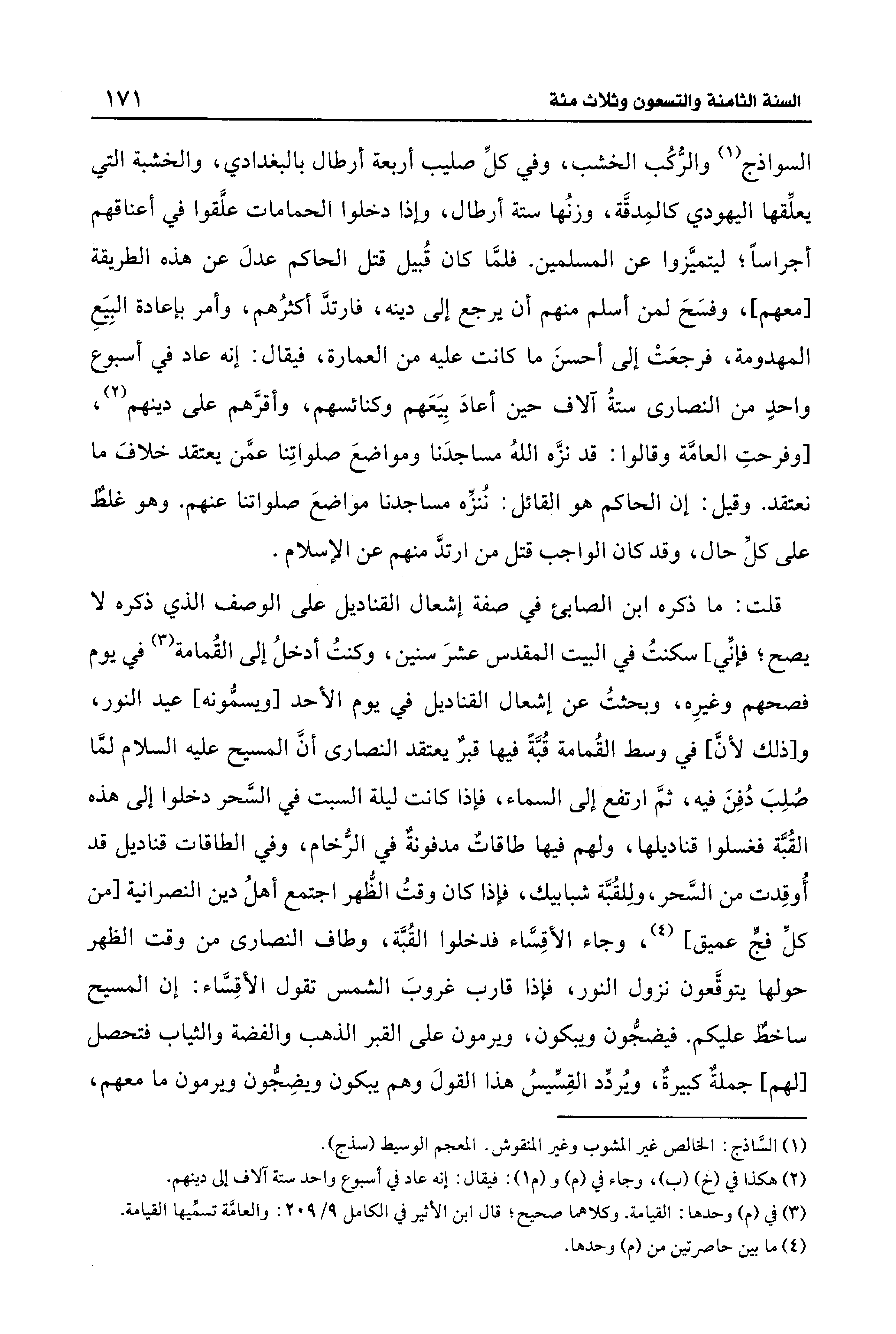 قلت: ما ذكره ابن الصابئ في صفة إشعال القناديل على الوصف الذي ذكره لا يصح؛ فإنِّي] سكنتُ في البيت المقدس عشرَ سنين، وكنتُ أدخلُ إلى القُمامة (¬3) في يوم فصحهم وغيرِه، وبحثتُ عن إشعال القناديل في يوم الأحد [ويسمُّونه] عيد النور، و [ذلك لأنَّ] في وسط القُمامة قُبَّةً فيها قبرٌ يعتقد النصارى أنَّ المسيح - عليه السلام - لمَّا صُلِبَ دُفِنَ فيه، ثمَّ ارتفع إلى السماء، فإذا كانت ليلة السبت في السَّحر دخلوا إلى هذه القُبَّة فغسلوا قناديلها، ولهم فيها طاقاتٌ مدفونةٌ في الرُّخام، وفي الطاقات قناديل قد أُوقِدت من السَّحر، ولِلقُبَّة شبابيك، فإذا كان وقتُ الظُّهر اجتمع أهلُ دين النصرانية [من كلِّ فجٍّ عميق] (¬4)، وجاء الأقِسَّاء فدخلوا القُبَّة، وطاف النصارى من وقت الظهر حولها يتوقَّعون نزول النور، فإذا قارب غروبَ الشمس تقول الأقِسَّاء: إن المسيح ساخطٌ عليكم. فيضجُّون ويبكون، ويرمون على القبر الذهب والفضة والثياب فتحصل [لهم] جملةٌ كبيرةٌ، ويُردِّد القِسِّيسُ هذا القولَ وهم يبكون ويضِجُّون ويرمون ما معهم،