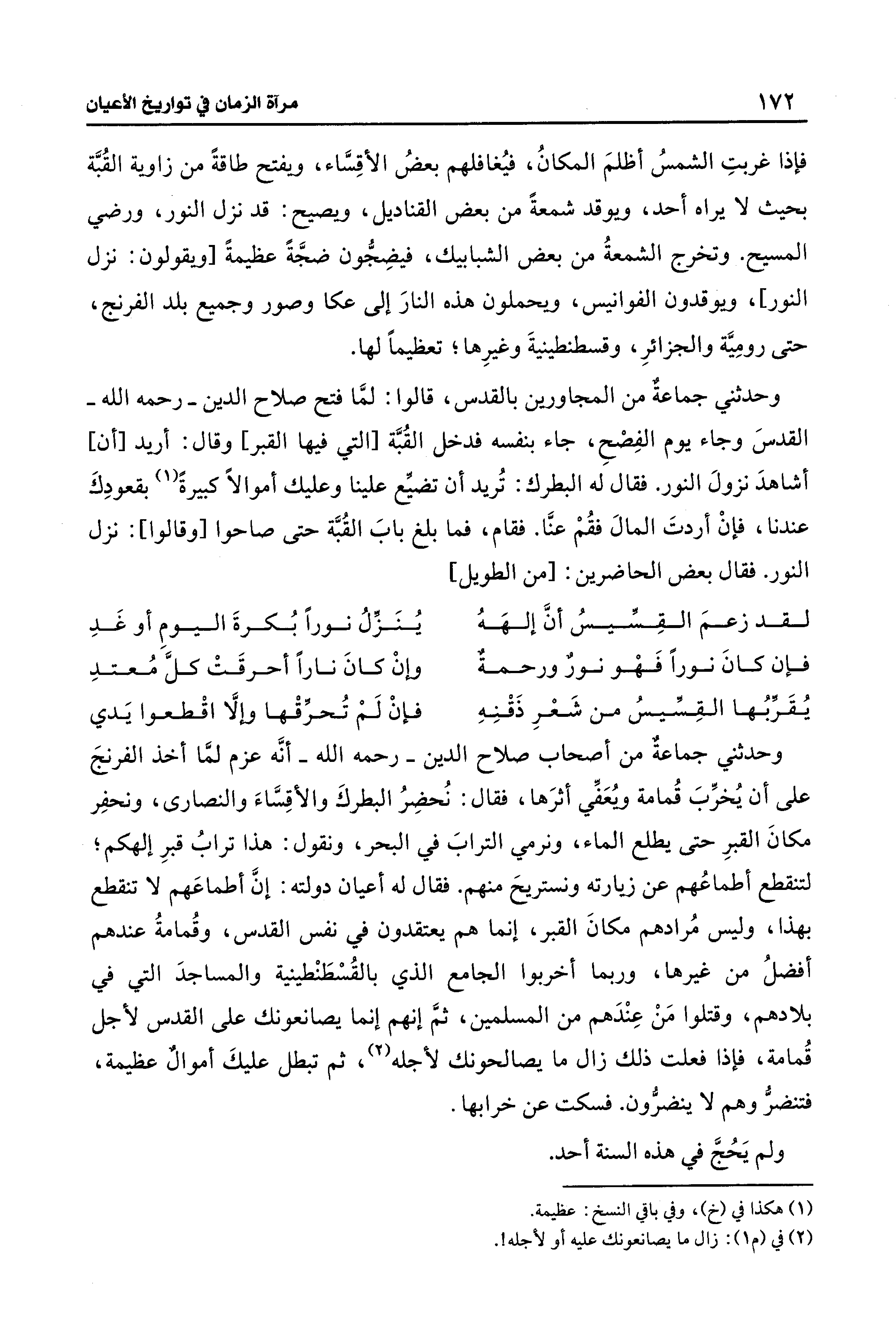 وحدثني جماعةٌ من المجاورين بالقدس، قالوا: لمَّا فتح صلاح الدين -رحمه الله- القدسَ وجاء يوم الفِصْحِ، جاء بنفسه فدخل القُبَّة [التي فيها القبر] وقال: أريد [أن] أشاهدَ نزولَ النور. فقال له البطرك: تُريد أن تضيِّع علينا وعليك أموالًا كبيرةً (¬1) بقعودِكَ عندنا، فإنْ أردتَ المال فقُمْ عنَّا. فقام، فما بلغ بابَ القُبَّة حتى صاحوا [وقالوا]: نزل النور. فقال بعض الحاضرين: [من الطويل]