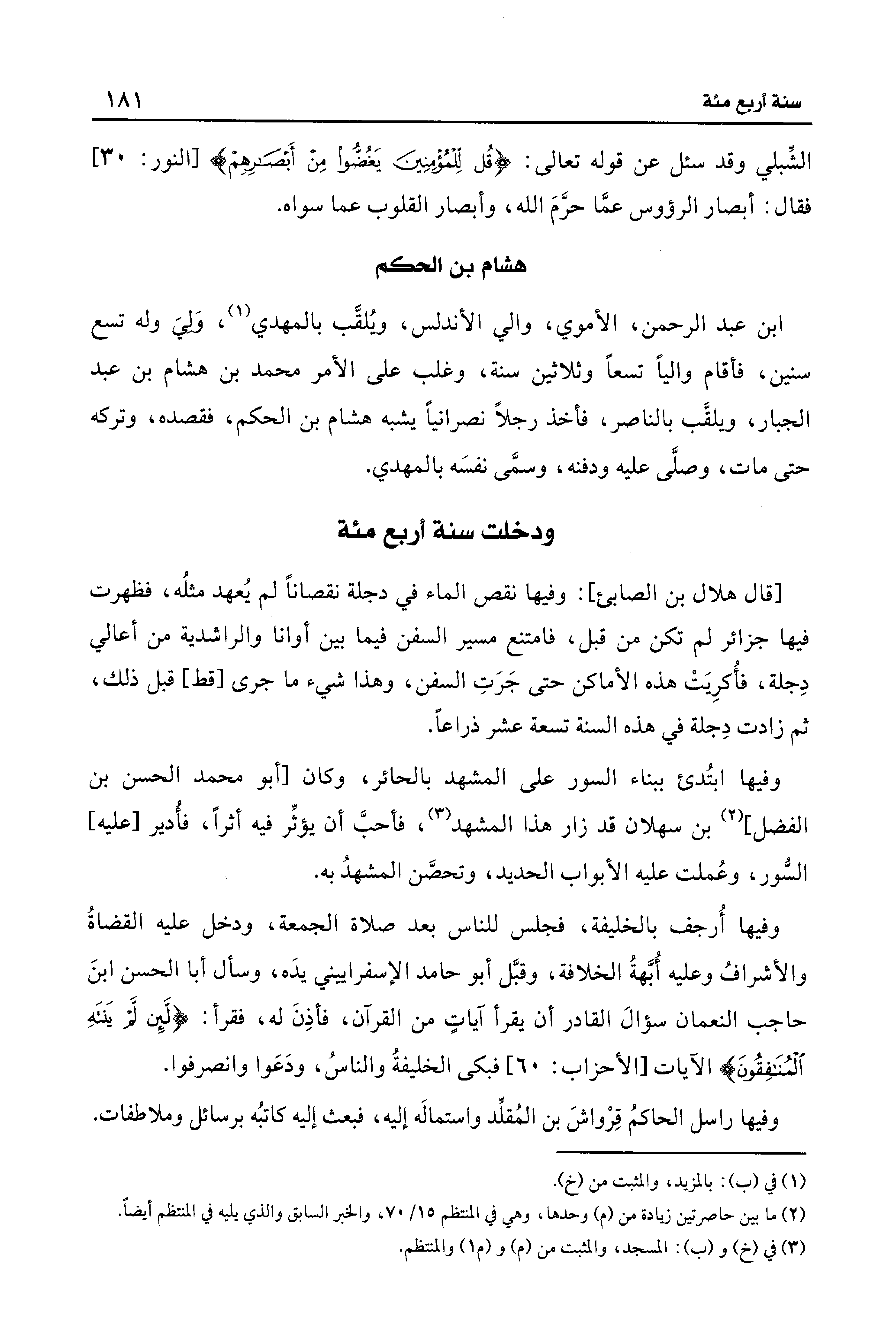 وفيها ابتُدئ ببناء السور على المشهد بالحائر، وكان [أبو محمَّد الحسن بن الفضل] (¬2) بن سهلان قد زار هذا المشهد (¬3)، فأحبَّ أن يؤثِّر فيه أثرًا، فأُدير [عليه] السُّور، وعُملت عليه الأبواب الحديد، وتحصَّن المشهدُ به.