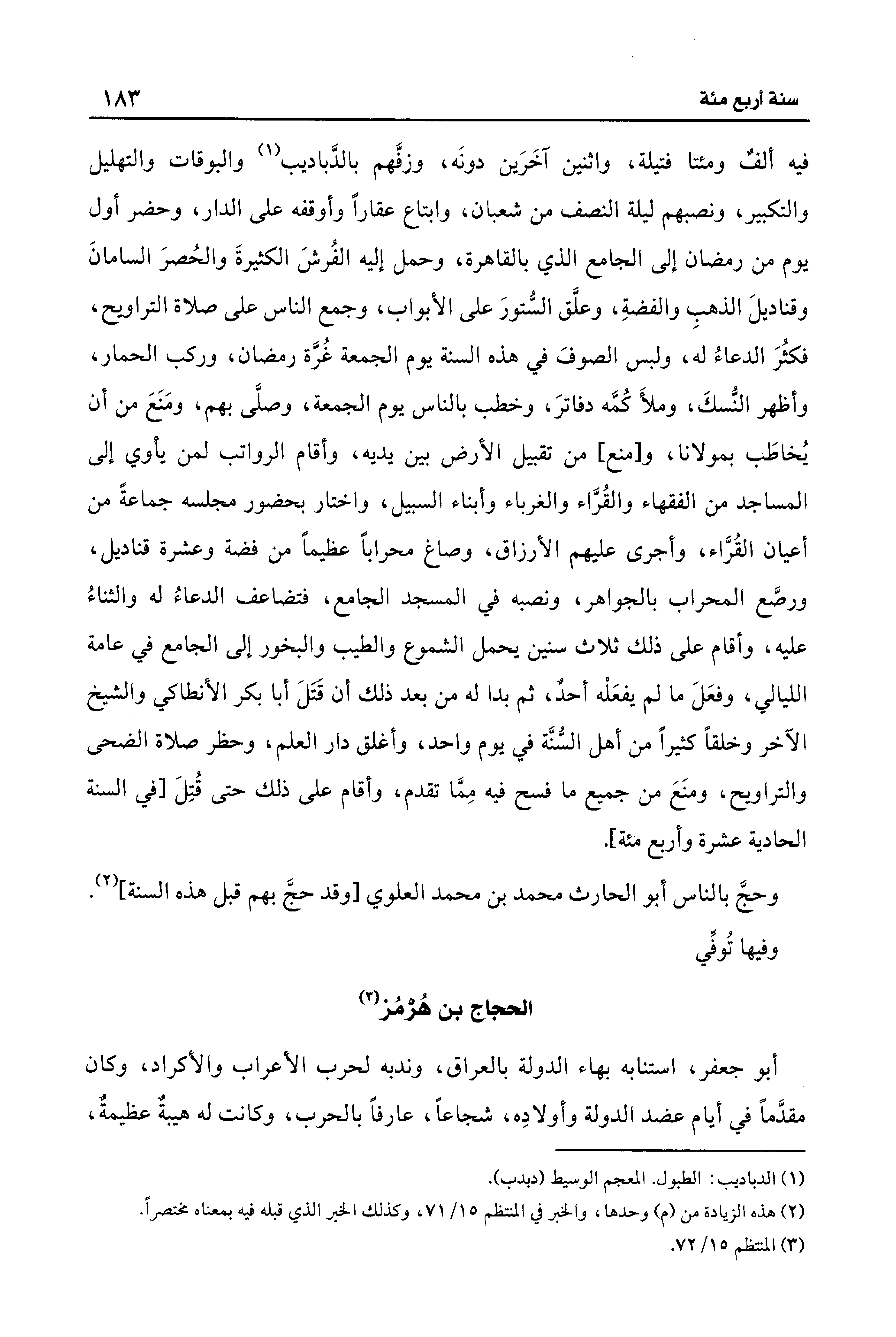 فيه ألفٌ ومئتا فتيلة، واثنين آخَرَين دونَه، وزفَّهم بالدَّباديب (¬1) والبوقات والتهليل والتكبير، ونصبهم ليلة النصف من شعبان، وابتاع عقارًا وأوقفه على الدار، وحضر أول يوم من رمضان إلى الجامع الذي بالقاهرة، وحمل إليه الفُرشَ الكثيرةَ والحُصرَ السامانَ وقناديلَ الذهبِ والفضةِ، وعلَّق السُّتورَ على الأبواب، وجمع الناس على صلاة التراويح، فكثُرَ الدعاءُ له، ولبس الصوفَ في هذه السنة يوم الجمعة غُرَّة رمضان، وركب الحمار، وأظهر النُّسكَ، وملأَ كُمَّه دفاترَ، وخطب بالناس يوم الجمعة، وصلَّى بهم، ومَنَعَ من أن يُخاطَب بمولانا، و [منع] من تقبيل الأرض بين يديه، وأقام الرواتب لمن يأوي إلى المساجد من الفقهاء والقُرَّاء والغرباء وأبناء السبيل، واختار بحضور مجلسه جماعةً من أعيان القُرَّاء، وأجرى عليهم الأرزاق، وصاغ محرابًا عظيمًا من فضة وعشرة قناديل، ورصَّع المحراب بالجواهر، ونصبه في المسجد الجامع، فتضاعف الدعاءُ له والثناءُ عليه، وأقام على ذلك ثلاث سنين يحمل الشموع والطيب والبخور إلى الجامع في عامة الليالي، وفعَلَ ما لم يفعَلْه أحدٌ، ثمَّ بدا له من بعد ذلك أن قَتَلَ أبا بكر الأنطاكي والشيخ الآخر وخلقًا كثيرًا من أهل السُّنَّة في يوم واحد، وأغلق دار العلم، وحظر صلاة الضحى والتراويح، ومنَعَ من جميع ما فسح فيه مِمَّا تقدم، وأقام على ذلك حتى قُتِلَ [في السنة الحادية عشرة وأربع مئة].