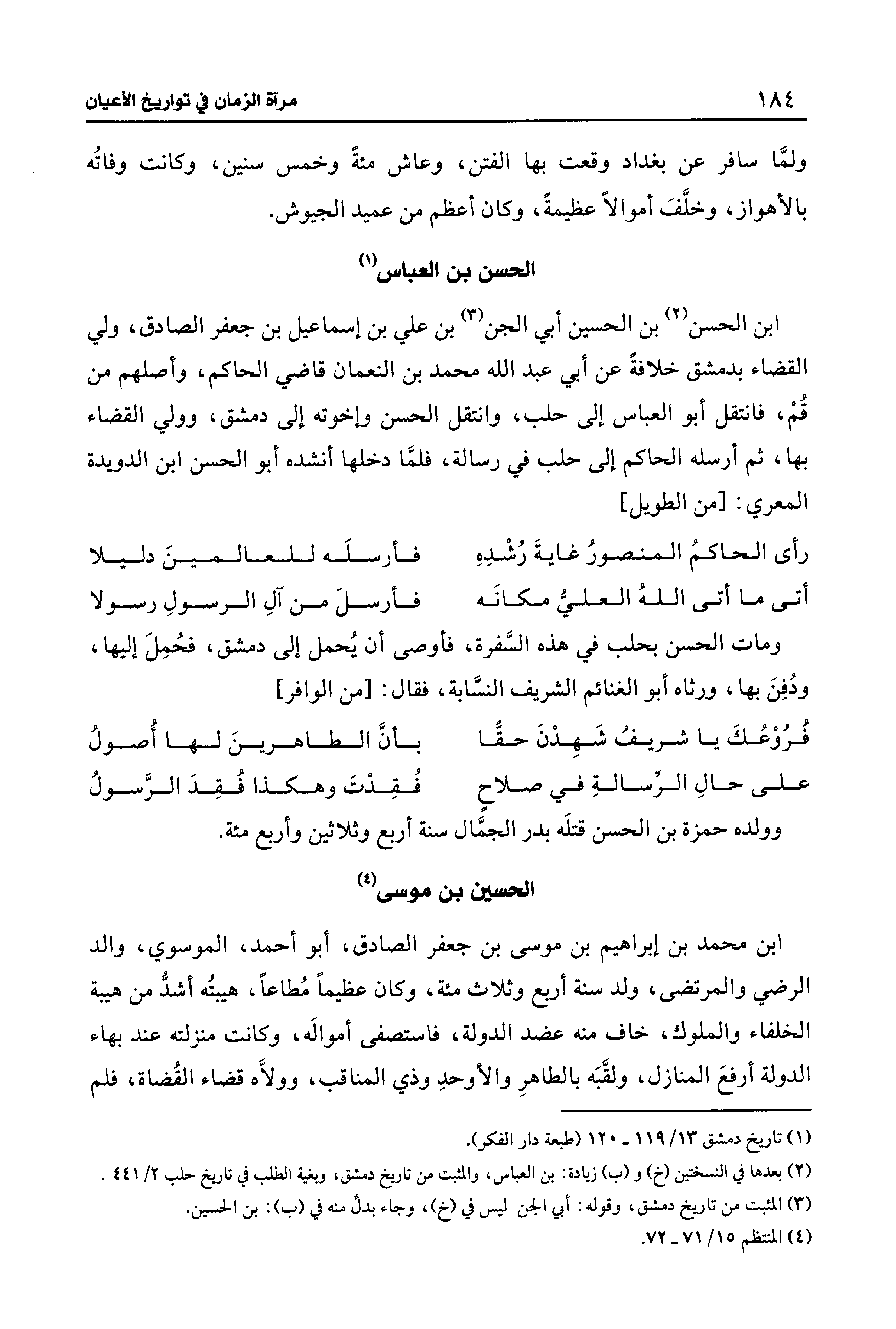ابن الحسن (¬2) بن الحسين أبي الجن (¬3) بن علي بن إسماعيل بن جعفر الصادق، ولي القضاء بدمشق خلافةً عن أبي عبد الله محمَّد بن النعمان قاضي الحاكم، وأصلهم من قُمْ، فانتقل أبو العباس إلى حلب، وانتقل الحسن وإخوته إلى دمشق، وولي القضاء بها، ثمَّ أرسله الحاكم إلى حلب في رسالة، فلمَّا دخلها أنشده أبو الحسن بن الدويدة المعري: [من الطويل]
