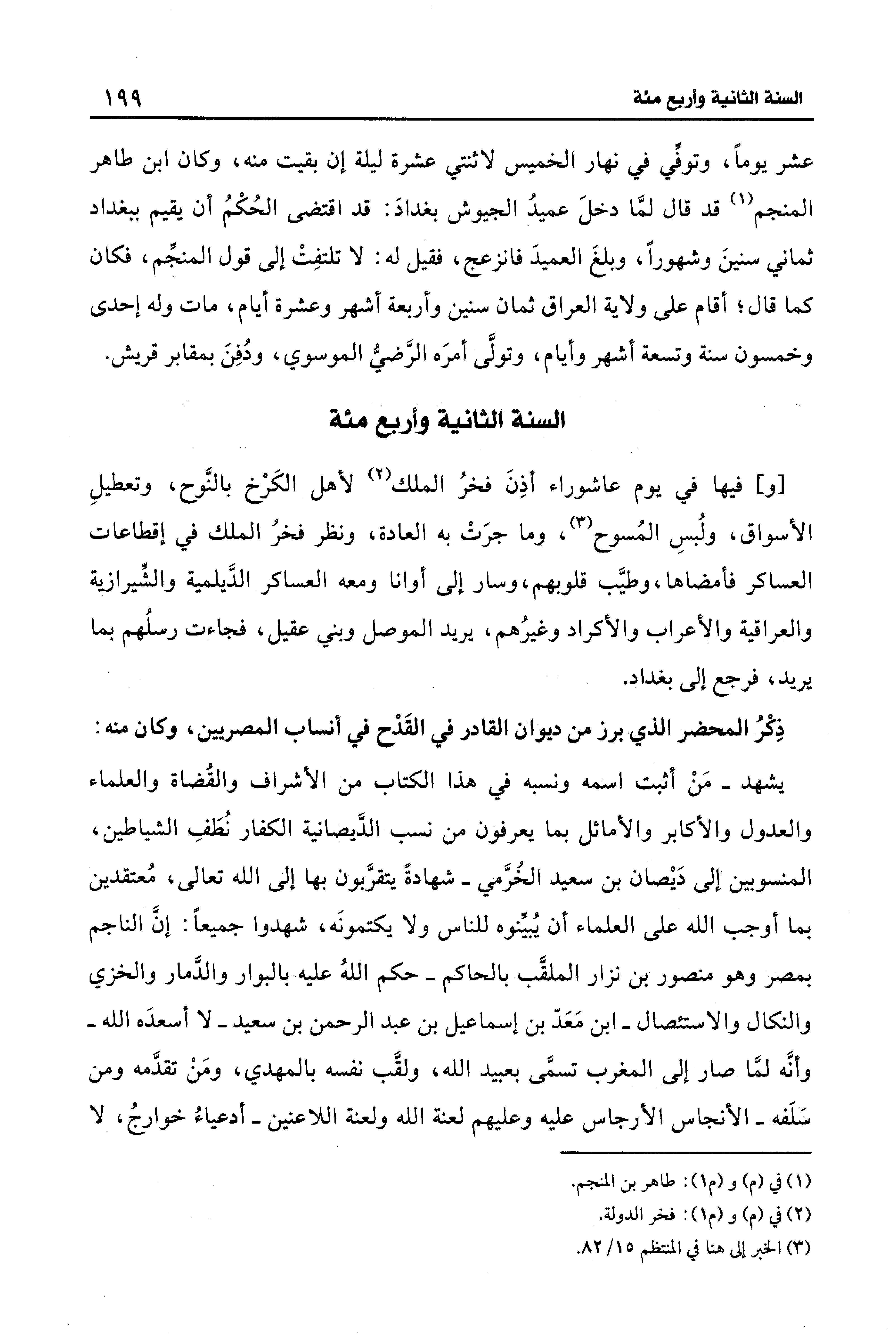 [و] فيها فِي يوم عاشوراء أذِنَ فخرُ الملك (¬2) لأهل الكَرْخ بالنَّوح، وتعطيلِ الأسواق، ولُبسِ المُسوح (¬3)، وما جرَتْ به العادة، ونظر فخرُ الملك فِي إقطاعات العساكر فأمضاها، وطيَّب قلوبهم، وسار إلى أوانا ومعه العساكر الدَّيلمية والشِّيرازية والعراقية والأعراب والأكراد وغيرُهم، يريد الموصل وبني عقيل، فجاءت رسلُهم بما يريد، فرجع إلى بغداد.