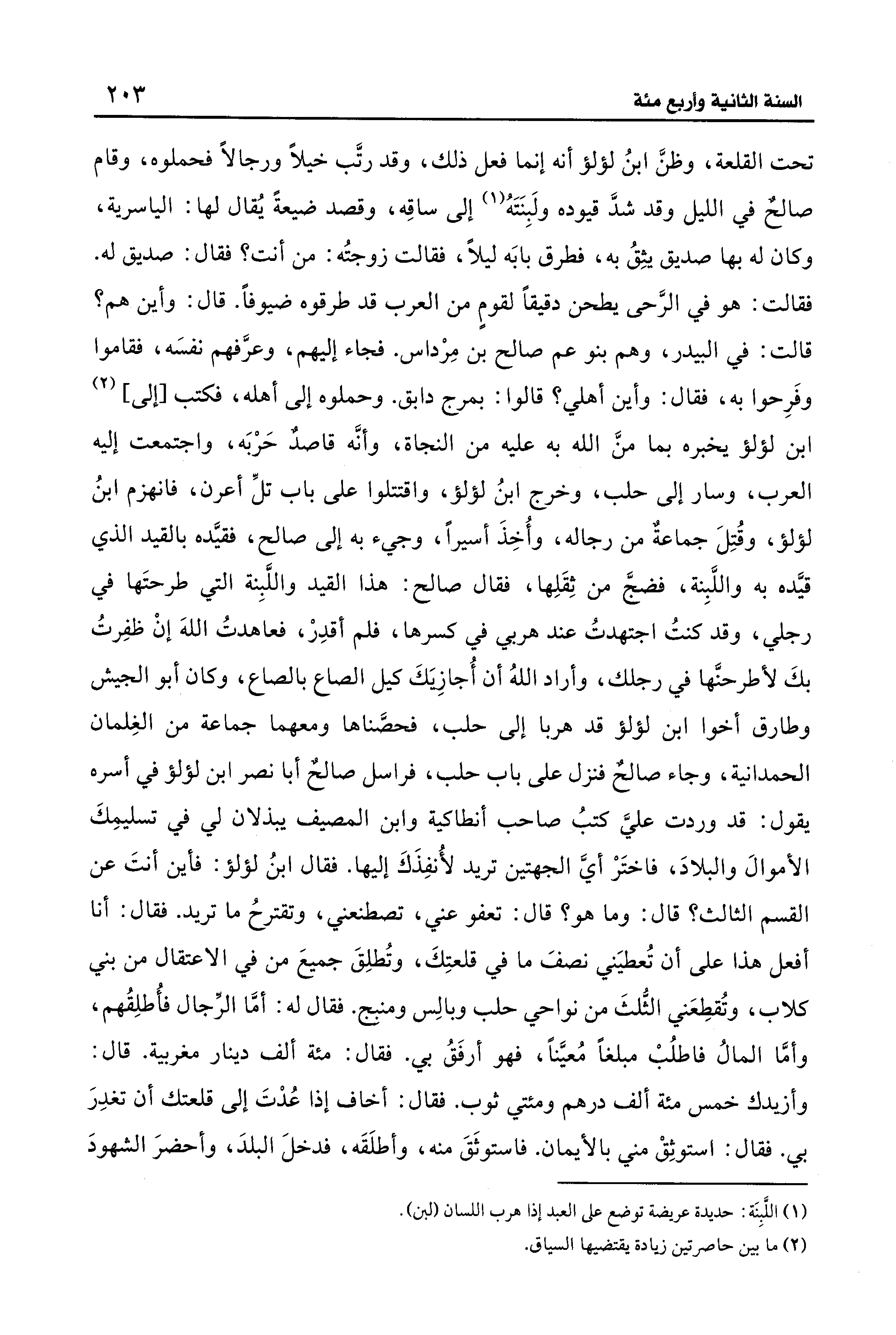 تحت القلعة، وظنَّ ابنُ لؤلؤ أنَّه إنما فعل ذلك، وقد رتَّب خيلًا ورجالًا فحملوه، وقام صالحٌ فِي الليل وقد شدَّ قيوده ولَبِنَتَهُ (¬1) إلى ساقِه، وقصد ضيعةً يُقال لها: الياسرية، وكان له بها صديق يثِقُ به، فطرق بابَه ليلًا، فقالت زوجتُه: من أنت؟ فقال: صديق له. فقالت: هو فِي الرَّحى يطحن دقيقًا لقومٍ من العرب قد طرقوه ضيوفًا. قال: وأين هم؟ قالت: فِي البيدر، وهم بنو عم صالح بن مِرْداس. فجاء إليهم، وعرَّفهم نفسَه، فقاموا وفَرِحوا به، فقال: وأين أهلي؟ قالوا: بمرج دابق. وحملوه إلى أهله، فكتب [إلى] (¬2) ابن لؤلؤ يخبره بما منَّ الله به عليه من النجاة، وأنَّه قاصدٌ حَرْبَه، واجتمعت إليه العرب، وسار إلى حلب، وخرج ابنُ لؤلؤ، واقتتلوا على باب تلِّ أعرن، فانهزم ابنُ لؤلؤ، وقُتِلَ جماعةٌ من رجاله، وأُخِذَ أسيرًا، وجيء به إلى صالح، فقيَّده بالقيد الَّذي قيَّده به واللَّبِنة، فضجَّ من ئِقَلِها، فقال صالح: هذا القيد واللَّبِنة التي طرحتَها فِي رجلي، وقد كُنْتُ اجتهدتُ عند هربي فِي كسرها، فلم أقدِرْ، فعاهدتُ اللهَ إنْ ظفِرتُ بكَ لأطرحنَّها فِي رجلك، وأراد اللهُ أن أُجازِيَكَ كيل الصاع بالصاع، وكان أبو الجيش وطارق أخوا ابن لؤلؤ قد هربا إلى حلب، فحصَّناها ومعهما جماعة من الغِلمان الحمدانية، وجاء صالحٌ فنزل على باب حلب، فراسل صالحٌ أبا نصر بن لؤلؤ فِي أسره يقول: قد وردت عليَّ كتبُ صاحب أنطاكية وابن المصيف يبذلان لي فِي تسليمِكَ الأموال والبلادَ، فاختَرْ أيَّ الجهتين تريد لأُنفِذَكَ إليها. فقال ابنُ لؤلؤ: فأين أنتَ عن القسم الثالث؟ قال: وما هو؟ قال: تعفو عني، تصطنعني، وتقترحُ ما تريد. فقال: أنا أفعل هذا على أن تُعطيَني نصفَ ما فِي قلعتِكَ، وتُطلِقَ جميعَ من فِي الاعتقال من بني كلاب، وتُقطعَني الثُّلثَ من نواحي حلب وبالِس ومنبج. فقال له: أمَّا الرّجال فأُطلِقُهم، وأمَّا المالُ فاطلُبْ مبلغًا مُعيَّنًا، فهو أرفَقُ بي. فقال: مئة ألف دينار مغربية. قال: وأزيدك خمس مئة الف درهم ومئتي ثوب. فقال: أخاف إذا عُدْتَ إلى قلعتك أن تغدِرَ بي. فقال: استوثِقْ مني بالأيمان. فاستوثَقَ منه، وأطلَقَه، فدخلَ البلدَ، وأحضرَ الشهودَ