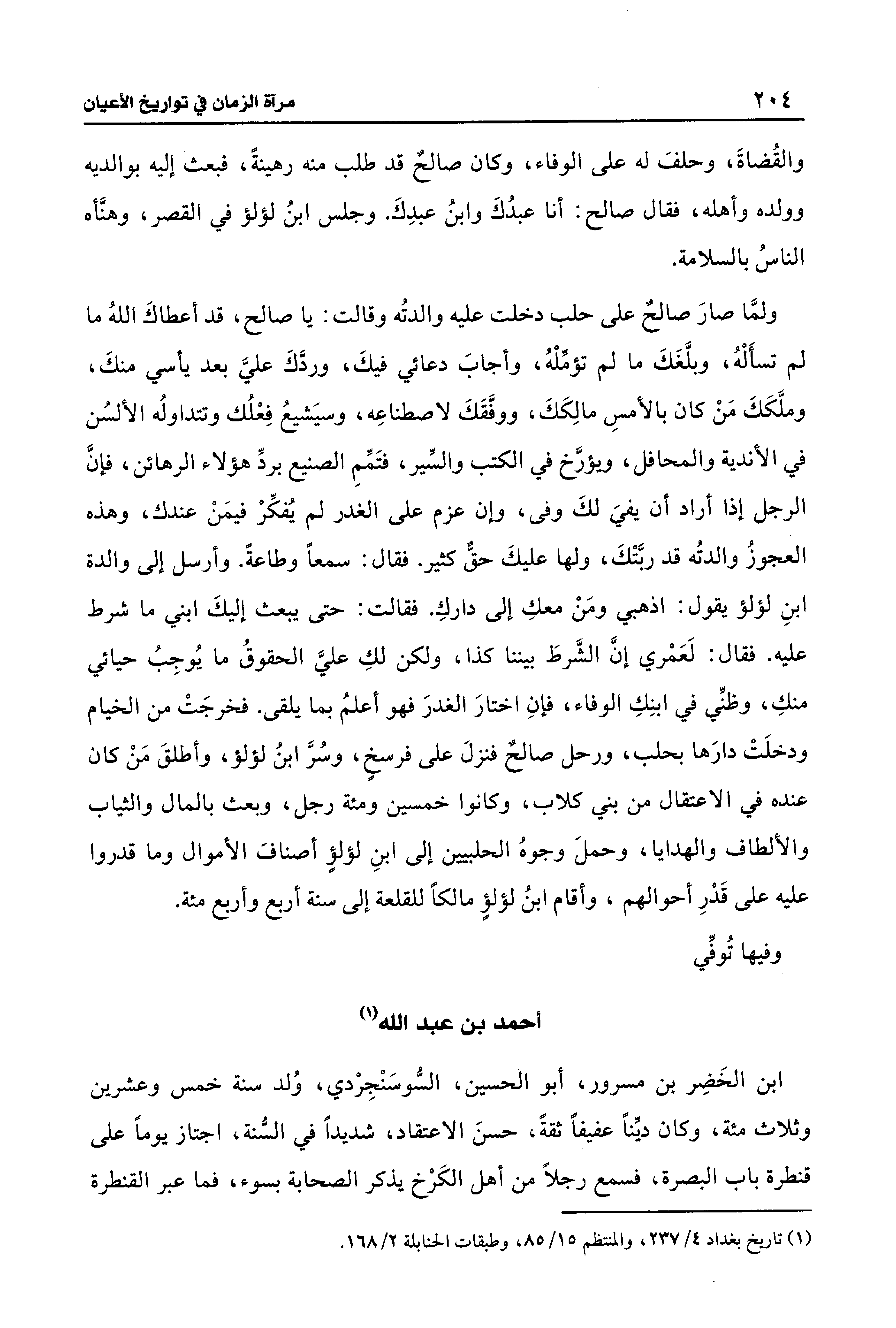 والقُضاةَ، وحلفَ له على الوفاء، وكان صالحٌ قد طلب منه رهينةً، فبعث إليه بوالديه وولده وأهله، فقال صالح: أنا عبدُكَ وابنُ عبدِكَ. وجلس ابنُ لؤلؤ فِي القصر، وهنَّأه الناسُ بالسلامة.