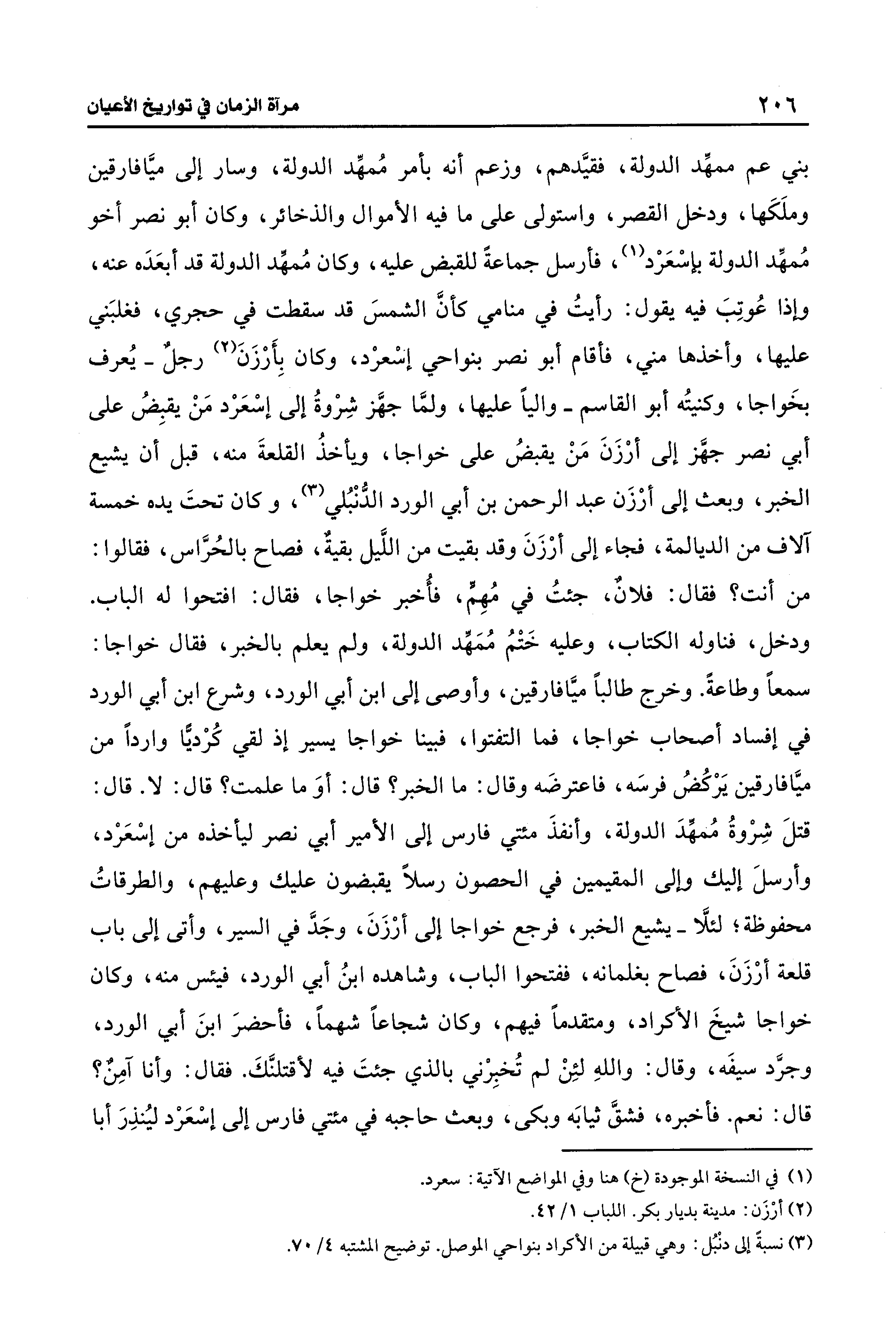 بني عم ممهِّد الدولة، فقيَّدهم، وزعم أنَّه بأمر مُمهِّد الدولة، وسار إلى ميَّافارقين وملَكَها، ودخل القصر، واستولى على ما فيه الأموال والذخائر، وكان أبو نصر أخو مُمهِّد الدولة بإسْعَرْد (¬1)، فأرسل جماعةً للقبض عليه، وكان مُمهِّد الدولة قد أبعَدَه عنه، وإذا عُوتِبَ فيه يقول: رأيتُ فِي منامي كأنَّ الشمسَ قد سقطت فِي حجري، فغلبَني عليها، وأخذها مني، فأقام أبو نصر بنواحي إسعرْد، وكان بِأَرْزَنَ (¬2) رجلٌ - يُعرف بخَواجا، وكنيتُه أبو القاسم - واليًا عليها، ولمَّا جهَّز شِرْوةُ إلى إسْعَرْد مَنْ يقبِضُ على أبي نصر جهَّز إلى أرْزَنَ مَنْ يقبضُ على خواجا، ويأخذُ القلعةَ منه، قبل أن يشيع الخبر، وبعث إلى أرْزَن عبد الرحمن بن أبي الورد الدُّنْبُلي (¬3)، وكان تحتَ يده خمسة آلاف من الديالمة، فجاء إلى أرْزَنَ وقد بقيت من اللَّيل بقيةٌ، فصاح بالحُرَّاس، فقالوا: من أنت؟ فقال: فلان، جئتُ فِي مُهِمٍّ، فأُخبر خواجا، فقال: افتحوا له الباب. ودخل، فناوله الكتاب، وعليه خَتْمُ مُمَهِّد الدولة، ولم يعلم بالخبر، فقال خواجا: سمعًا وطاعةً. وخرج طالبًا ميَّافارقين، وأوصى إلى ابن أبي الورد، وشرع ابن أبي الورد فِي إفساد أصحاب خواجا، فما التفتوا، فبينا خواجا يسير إذ لقي كُرْديًّا واردًا من ميَّافارقين يَرْكُضُ فرسَه، فاعترضَه وقال: ما الخبر؟ قال: أوَ ما علمت؟ قال: لا. قال: قتلَ شِرْوةُ مُمهِّدَ الدولة، وأنفذَ مئتي فارس إلى الأمير أبي نصر ليأخذه من إسْعَرْد، وأرسلَ إليك وإلى المقيمين فِي الحصون رسلًا يقبضون عليك وعليهم، والطرقاتُ محفوظة؛ لئلَّا - يشيع الخبر، فرجع خواجا إلى أرْزَنَ، وجَدَّ فِي السير، وأتى إلى باب قلعة أرْزَنَ، فصاح بغلمانه، ففتحوا الباب، وشاهده ابنُ أبي الورد، فيئس منه، وكان خواجا شيخَ الأكراد، ومتقدمًا فيهم، وكان شجاعًا شهمًا، فأحضرَ ابنَ أبي الورد، وجرَّد سيفَه، وقال: واللهِ لئِنْ لم تُخبِرْني بالذي جئتَ فيه لأقتلنَّكَ. فقال: وأنا آمِن؟ قال: نعم. فأخبره، فشقَّ ثيابَه وبكى، وبعث حاجبه فِي مئتي فارس إلى إسْعَرْد ليُنذِرَ أبا