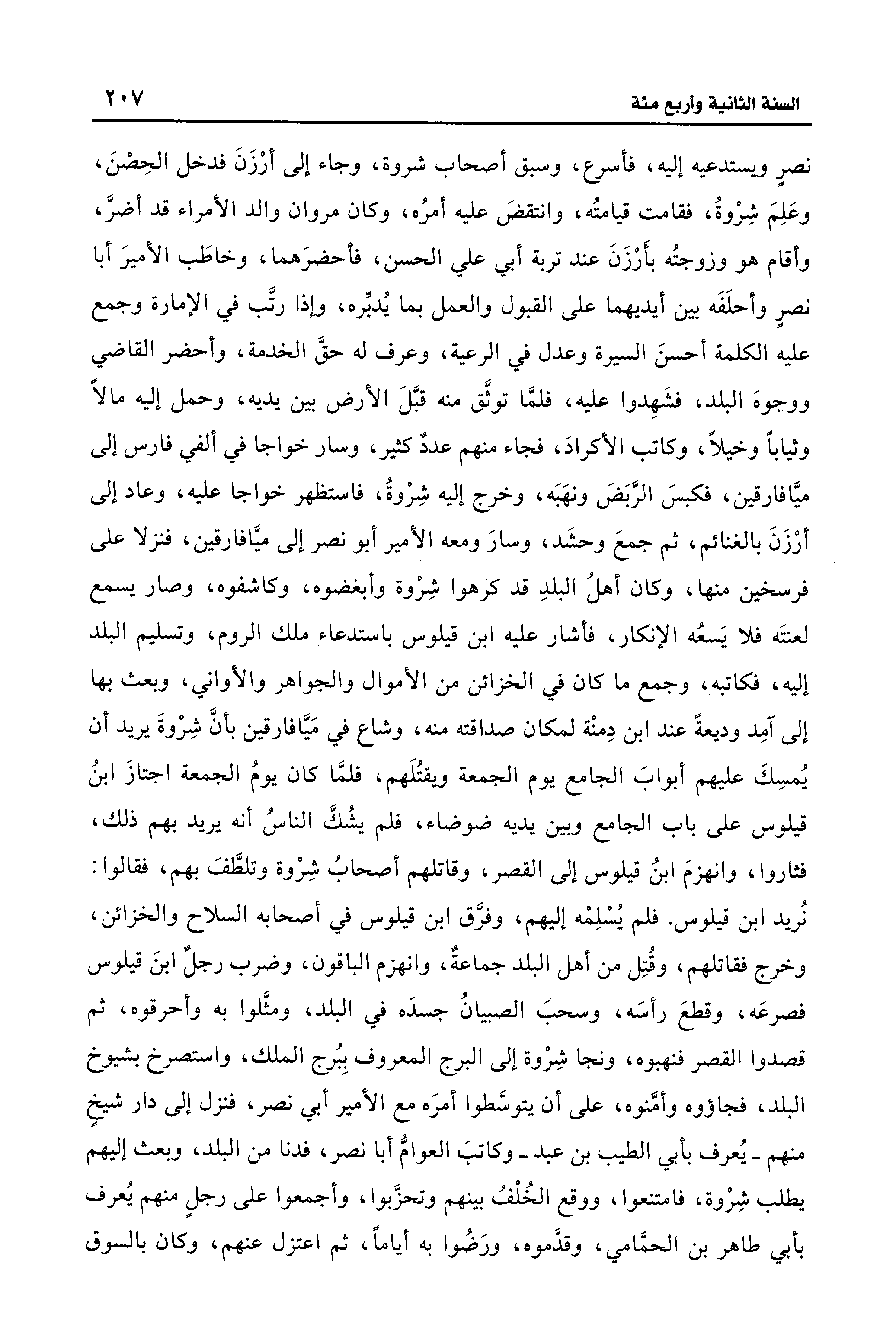 نصرٍ ويستدعيه إليه، فأسرع، وسبق أصحاب شروة، وجاء إلى أرْزَنَ فدخل الحِصْنَ، وعَلِمَ شِرْوةُ، فقامت قيامتُه، وانتقضَ عليه أمرُه، وكان مروان والد الأمراء قد أضرَّ، وأقام هو وزوجتُه بأَرْزَنَ عند تربة أبي علي الحسن، فأحضرَهما، وخاطَب الأميرَ أبا نصرٍ وأحلَفَه بين أيديهما على القبول والعمل بما يُدبِّره، وإذا رتَّب فِي الإمارة وجمع عليه الكلمة أحسنَ السيرة وعدل فِي الرعية، وعرف له حقَّ الخدمة، وأحضر القاضي ووجوهَ البلد، فشَهِدوا عليه، فلمَّا توثَق منه قبَّلَ الأرض بين يديه، وحمل إليه مالًا وثيابًا وخيلًا، وكاتب الأكرادَ، فجاء منهم عددٌ كثير، وسار خواجا فِي ألفي فارس إلى ميَّافارقين، فكبسَ الرَّبَضَ ونهَبَه، وخرج إليه شِرْوةُ، فاستظهر خواجا عليه، وعاد إلى أرْزَنَ بالغنائم، ثم جمعَ وحشَد، وسارَ ومعه الأمير أبو نصر إلى ميَّافارقين، فنزلا على فرسخين منها، وكان أهلُ البلدِ قد كرهوا شِرْوة وأبغضوه، وكاشفوه، وصار يسمع لعنتَه فلا يَسعُه الإنكار، فأشار عليه ابن قيلوس باستدعاء ملك الروم، وتسليم البلد إليه، فكاتبه، وجمع ما كان فِي الخزائن من الأموال والجواهر والأواني، وبعث بها إلى آمِد وديعةً عَند ابن دِمنْة لمكان صداقته منه، وشاع فِي مَيَّافارقين بأنَّ شِرْوةَ يريد أن يُمسِكَ عليهم أبوابَ الجامع يوم الجمعة ويقتُلَهم، فلمَّا كان يومُ الجمعة اجتازَ ابنُ قيلوس على باب الجامع وبين يديه ضوضاء، فلم يشُكَّ الناسُ أنَّه يريد بهم ذلك، فثاروا، وانهزمَ ابنُ قيلوس إلى القصر، وقاتلهم أصحابُ شِرْوة وتلطَّفَ بهم، فقالوا: نُريد ابن قيلوس. فلم يُسْلِمْه إليهم، وفرَّق ابن قيلوس فِي أصحابه السلاح والخزائن، وخرج فقاتلهم، وقُتِل من أهل البلد جماعةٌ، وانهزم الباقون، وضرب رجلٌ ابنَ قيلوس فصرعَه، وقطعَ رأسَه، وسحبَ الصبيانُ جسدَه فِي البلد، ومثَّلوا به وأحرقوه، ثم قصدوا القصر فنهبوه، ونجا شِرْوة إلى البرج المعروف بِبُرج الملك، واستصرخ بشيوخ البلد، فجاؤوه وأمَّنوه، على أن يتوسَّطوا أمرَه مع الأمير أبي نصر، فنزل إلى دار شيخٍ منهم - يُعرف بأبي الطيب بن عبد - وكاتبَ العوامُّ أبا نصر، فدنا من البلد، وبعث إليهم يطلب شِرْوة، فامتنعوا، ووقع الخُلْفُ بينهم وتحزَّبوا، وأجمعوا على رجلٍ منهم يُعرف بأبي طاهر بن الحمَّامي، وقدَّموه، ورَضُوا به أيامًا، ثم اعتزل عنهم، وكان بالسوق