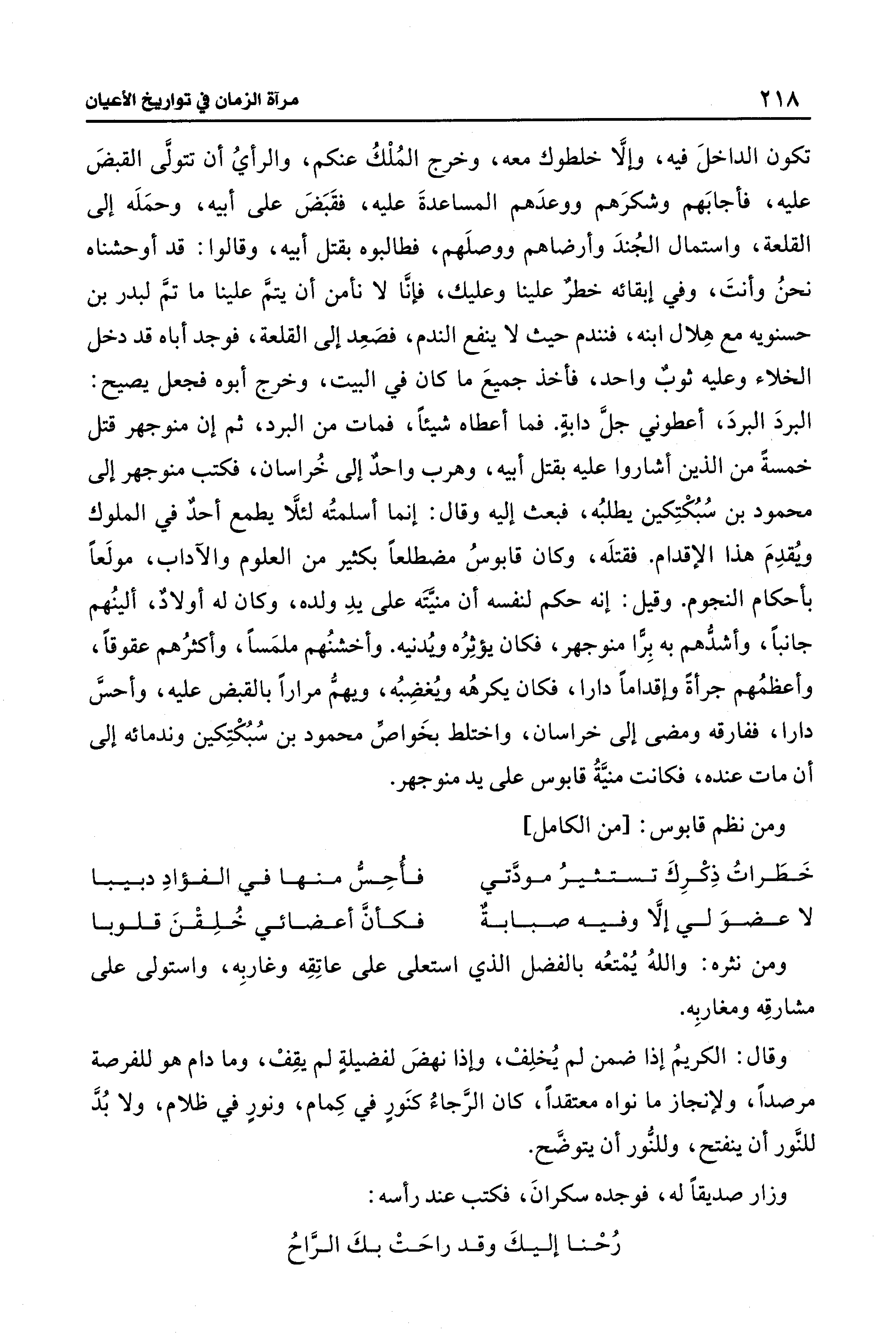 تكون الداخلَ فيه، وإلَّا خلطوك معه، وخرج المُلْكُ عنكم، والرأيُ أن تتولَّى القبضَ عليه، فأجابَهم وشكرَهم ووعدَهم المساعدةَ عليه، فقَبَضَ على أبيه، وحمَلَه إلى القلعة، واستمال الجُندَ وأرضاهم ووصلَهم، فطالبوه بقتل أبيه، وقالوا: قد أوحشناه نحنُ وأنتَ، وفي إبقائه خطرٌ علينا وعليك، فإنَّا لا نأمن أن يتمَّ علينا ما تمَّ لبدر بن حسنويه مع هِلال ابنه، فنندم حيث لا ينفع الندم، فصَعِد إلى القلعة، فوجد أباه قد دخل الخلاء وعليه ثوبٌ واحد، فأخذ جميعَ ما كان فِي البيت، وخرج أبوه فجعل يصيح: البردَ البردَ، أعطوني جلَّ دابةٍ. فما أعطاه شيئًا، فمات من البرد، ثم إن منوجهر قتل خمسةً من الذين أشاروا عليه بقتل أبيه، وهرب واحدٌ إلى خُراسان، فكتب منوجهر إلى محمود بن سُبُكْتِكين يطلبُه، فبعث إليه وقال: إنما أسلمتُه لئلَّا يطمع أحدٌ فِي الملوك ويُقدِمَ هذا الإقدام. فقتلَه، وكان قابوسُ مضطلعًا بكثير من العلوم والآداب، مولَعًا بأحكام النجوم. وقيل: إنه حكم لنفسه أن منيَّتَه على يدِ ولده، وكان له أولادٌ، ألينُهم جانبًا، وأشدُّهم به بِرًّا منوجهر، فكان يؤثِرُه ويُدنيه. وأخشنُهم ملمَسًا، وأكثرُهم عقوقًا، وأعظمُهم جرأةً وإقدامًا دارا، فكان يكرهُه ويُغضِبُه، ويهمُّ مرارًا بالقبض عليه، وأحسَّ دارا، ففارقه ومضى إلى خراسان، واختلط بخَواصِّ محمود بن سُبُكْتِكين وندمائه إلى أن مات عنده، فكانت منيَّةُ قابوس على يد منوجهر.