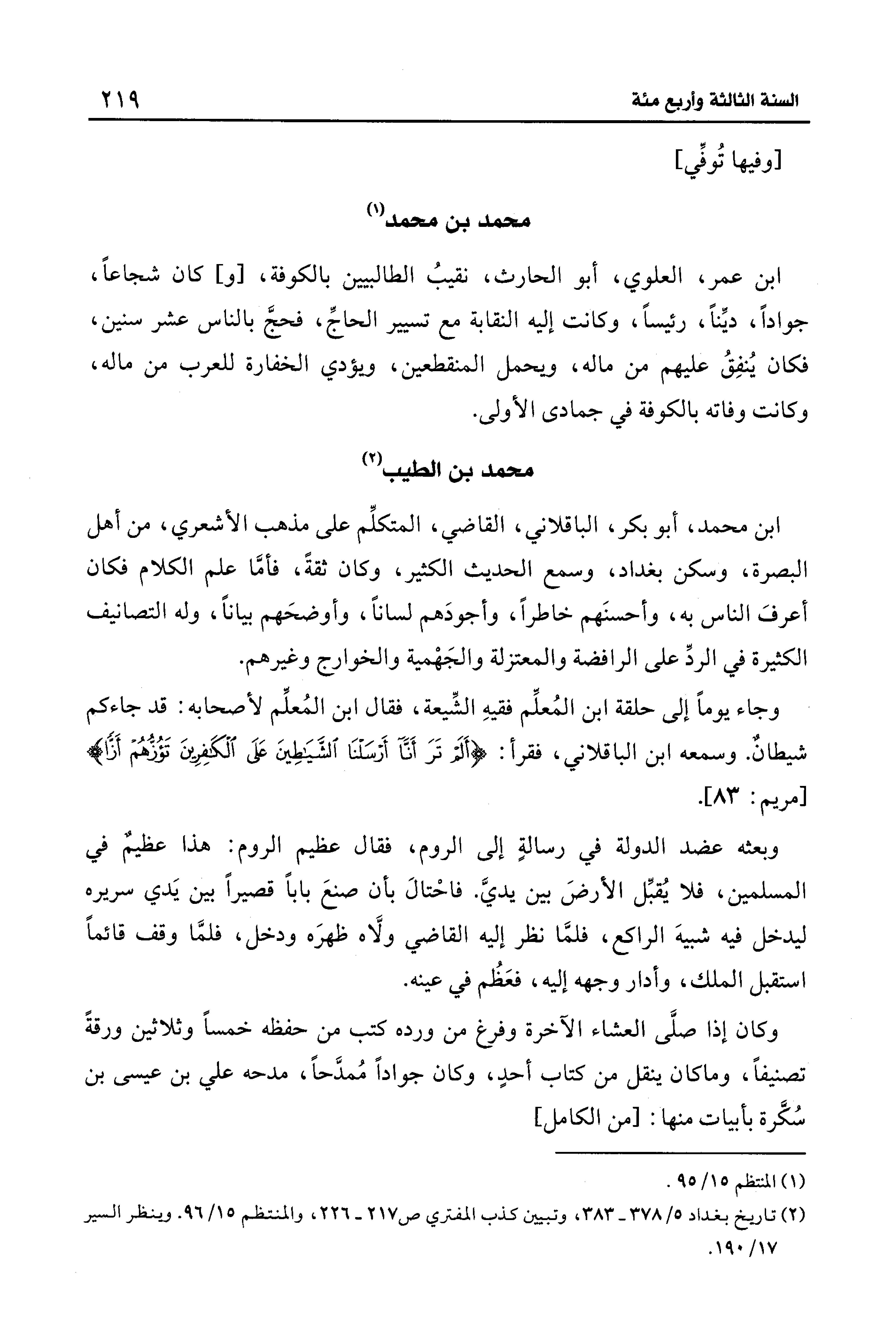 ابن محمد، أبو بكر، الباقلاني، القاضي، المتكلِّم على مذهب الأشعري، من أهل البصرة، وسكن بغداد، وسمع الحديث الكثير، وكان ثقة، فأمَّا علم الكلام فكان أعرفَ الناس به، وأحسنَهم خاطرًا، وأجودَهم لسانًا، وأوضحَهم بيانًا، وله التصانيف الكثيرة فِي الردِّ على الرافضة والمعتزلة والجَهْمية والخوارج وغيرهم.