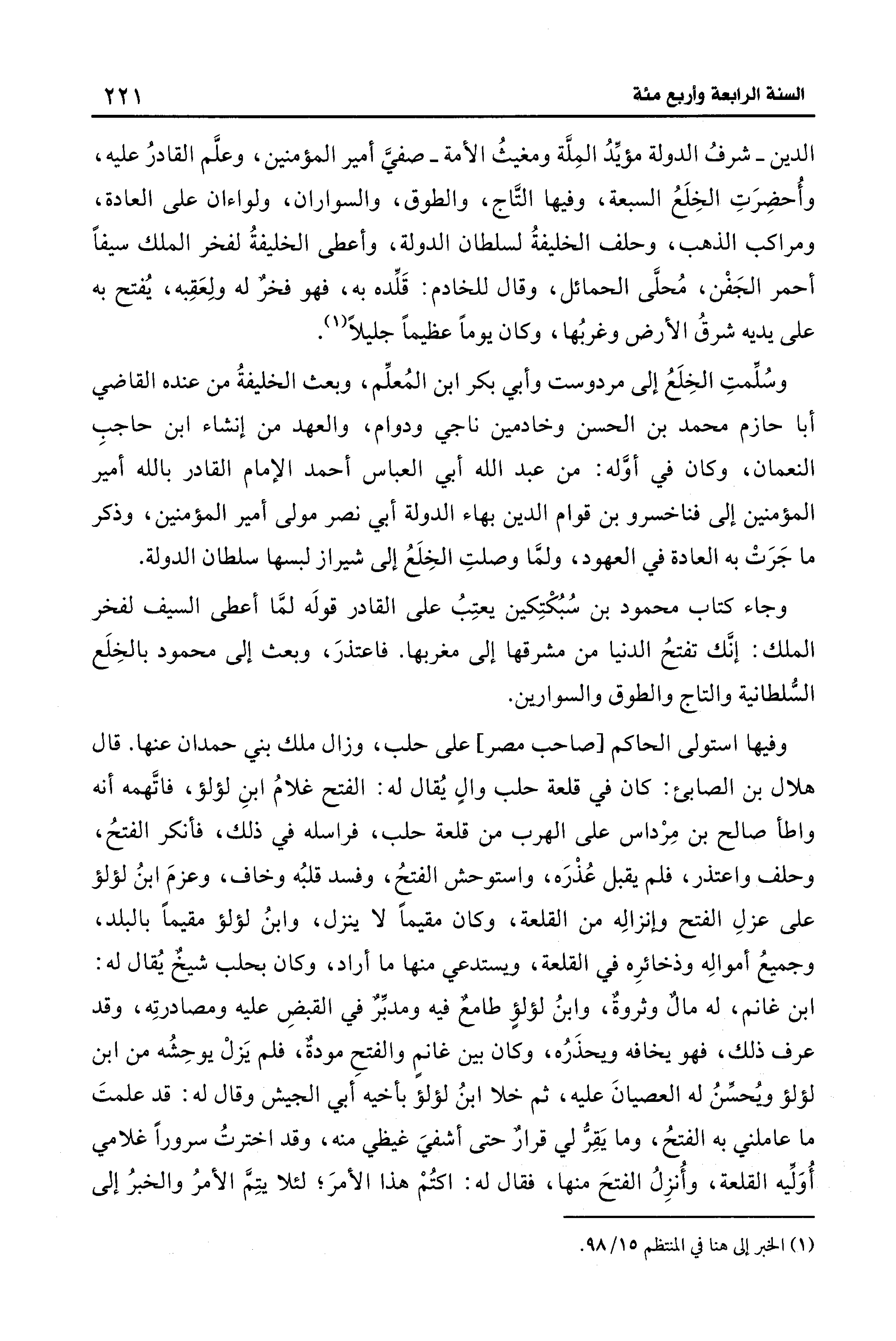 الدين - شرفُ الدولة مؤيِّدُ المِلَّة ومغيثُ الأمة - صفيَّ أمير المؤمنين، وعلَّم القادرُ عليه، وأُحضِرَتِ الخِلَعُ السبعة، وفيها التَّاج، والطوق، والسواران، ولواءان على العادة، ومراكب الذهب، وحلف الخليفةُ لسلطان الدولة، وأعطى الخليفةُ لفخر الملك سيفًا أَحمر الجَفْن، مُحلَّى الحمائل، وقال للخادم: قَلِّده به، فهو فخرٌ له ولعَقِبه، يُفتح به على يديه شرقُ الأرض وغربُها، وكان يومًا عظيمًا جليلًا (¬1).