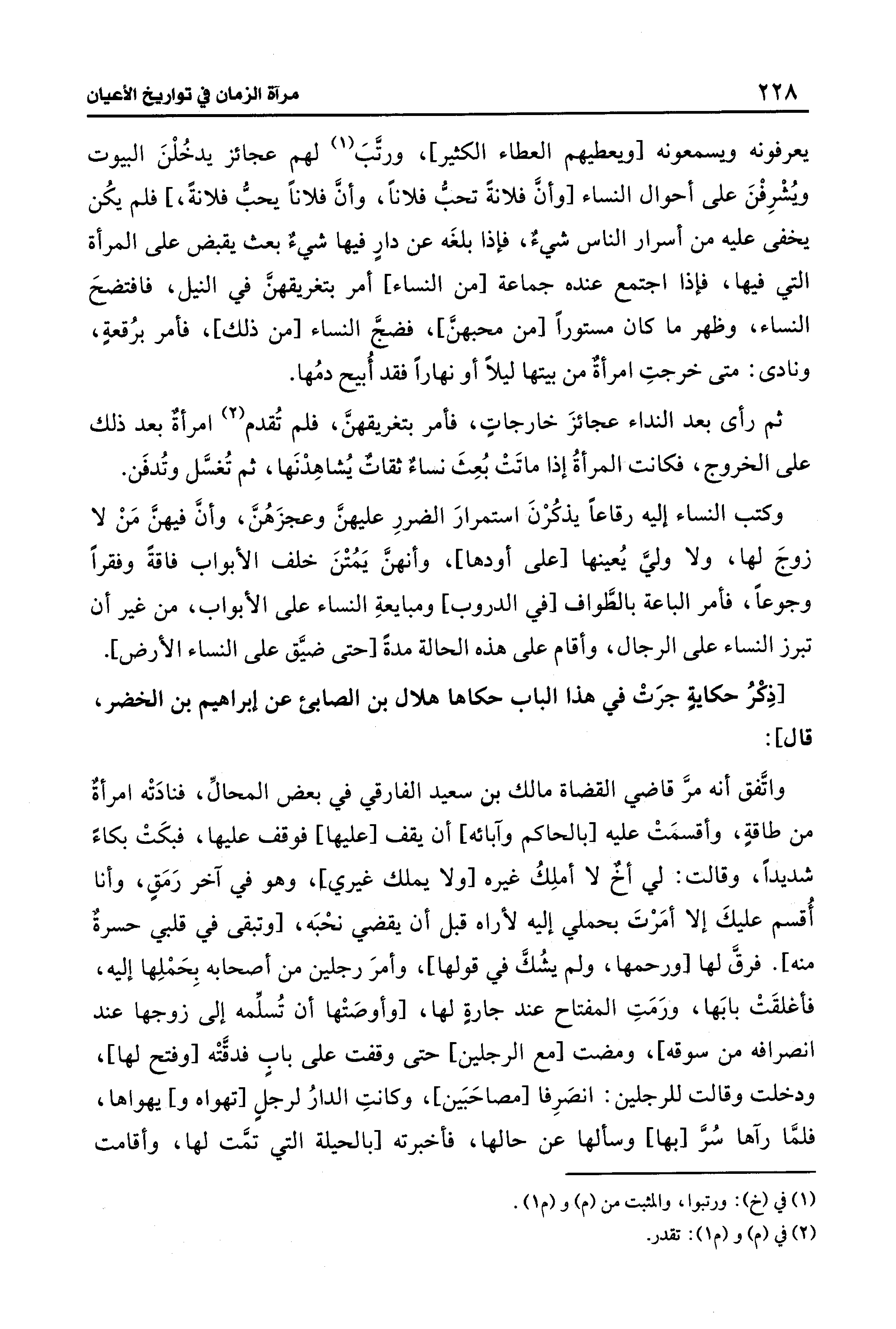 [ذِكْرُ حكايةٍ جرَتْ فِي هذا الباب حكاها هلال بن الصابئ عن إبراهيم بن الخضر، قال]: واتَّفق أنَّه مرَّ قاضي القضاة مالك بن سعيد الفارقي فِي بعض المحالِّ، فنادَتْه امرأةٌ من طاقةٍ، وأقسمَتْ عليه [بالحاكم وآبائه] أن يقف [عليها] فوقف عليها، فبكَتْ بكاءً شديدًا، وقالت: لي أخٌ لا أملِكُ غيره [ولا يملك غيري]، وهو فِي آخر رَمَقٍ، وأنا أُقسم عليكَ إلَّا أمَرْتَ بحملي إليه لأراه قبل أن يقضي نحْبَه، [وتبقى فِي قلبي حسرةٌ منه]. فرقَّ لها [ورحمها، ولم يشُكَّ فِي قولها]، وأمرَ رجلين من أصحابه بِحَمْلِها إليه، فأغلقَتْ بابَها، ورَمَتِ المفتاح عند جارةٍ لها، [وأوصَتْها أن تُسلِّمه إلى زوجها عند انصرافه من سوقه]، ومضت [مع الرجلين] حتَّى وقفت على بابٍ فدقَّتْه [وفتح لها]، ودخلت وقالت للرجلين: انصَرِفا [مصاحَبَين]، وكانتِ الدارُ لرجلٍ [تهواه و] يهواها، فلمَّا رآها سُرَّ [بها] وسألها عن حالها، فأخبرته [بالحيلة التي تمَّت لها، وأقامت