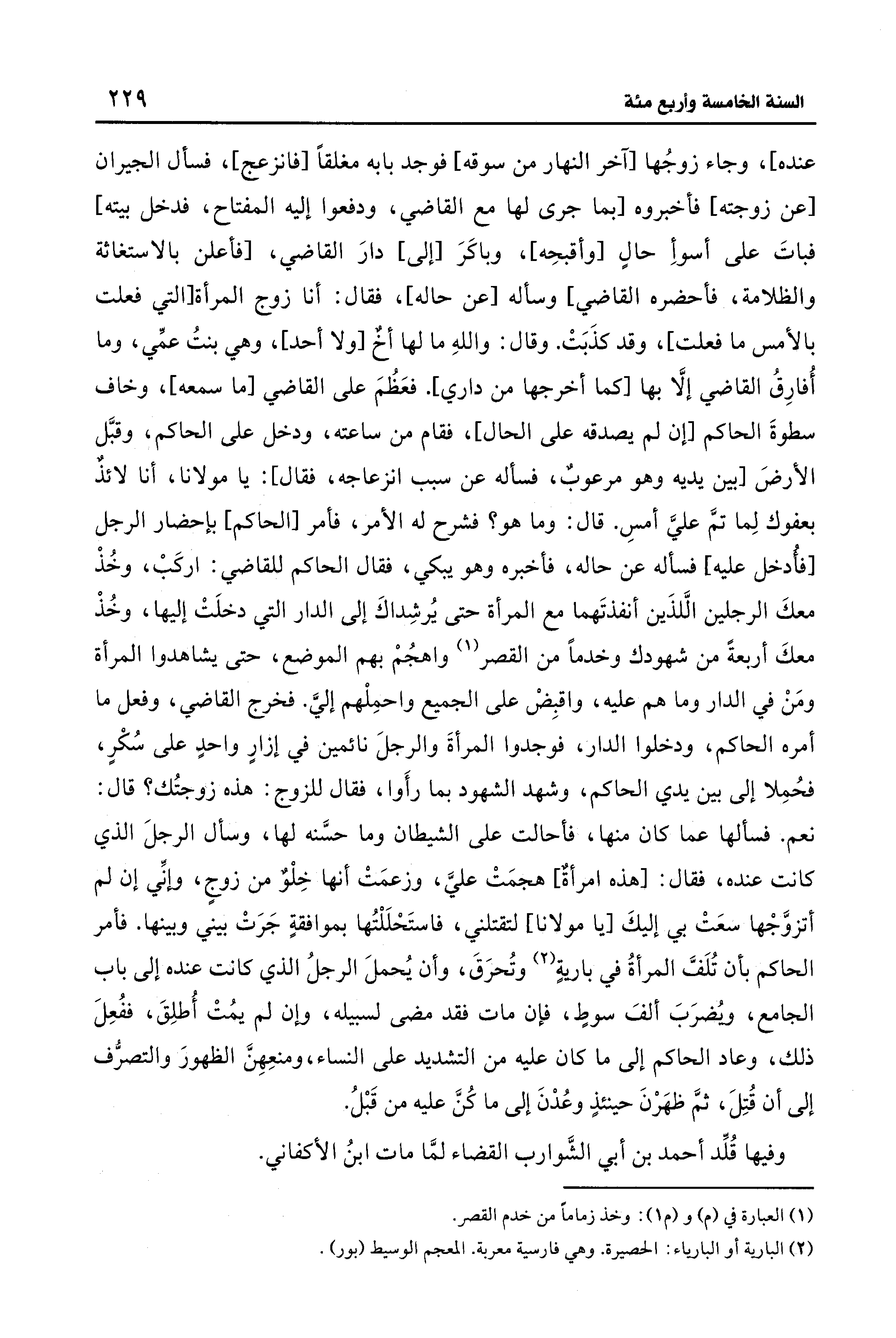 عنده]، وجاء زوجُها [آخر النهار من سوقه] فوجد بابه مغلقًا [فانزعج]، فسأل الجيران [عن زوجته] فأخبروه [بما جرى لها مع القاضي، ودفعوا إليه المفتاح، فدخل بيته] فباتَ على أسوأ حالٍ [وأقبحِه]، وباكَرَ [إلى] دارَ القاضي، [فأعلن بالاستغاثة والظلامة، فأحضره القاضي] وسأله [عن حاله]، فقال: أنا زوج المرأة [التي فعلت بالأمس ما فعلت]، وقد كذَبَتْ. وقال: واللهِ ما لها أخٌ [ولا أحد]، وهي بنتُ عمِّي، وما أُفارِقُ القاضي إلَّا بها [كما أخرجها من داري]. فعَظُمَ على القاضي [ما سمعه]، وخاف سطوةَ الحاكم [إن لم يصدقه على الحال]، فقام من ساعته، ودخل على الحاكم، وقبَّل الأرضَ [بين يديه وهو مرعوبٌ، فسأله عن سبب انزعاجه، فقال]: يا مولانا، أنا لائذٌ بعفوك لِما تمَّ عليَّ أمسِ. قال: وما هو؟ فشرح له الأمر، فأمر [الحاكم] بإحضار الرجل [فأُدخل عليه] فسأله عن حاله، فأخبره وهو يبكي، فقال الحاكم للقاضي: اركَبْ، وخُذْ معكَ الرجلين الَّلذَين أنفذتَهما مع المرأة حتَّى يُرشِداكَ إلى الدار التي دخلَتْ إليها، وخُذْ معكَ أربعة من شهودك وخدمًا من القصر (¬1) واهجُمْ بهم الموضع، حتَّى يشاهدوا المرأة ومَنْ فِي الدار وما هم عليه، واقبِضْ على الجميع واحمِلْهم إليَّ. فخرج القاضي، وفعل ما أمره الحاكم، ودخلوا الدار، فوجدوا المرأةَ والرجلَ نائمين فِي إزارٍ واحدٍ على سُكْرٍ، فحُمِلا إلى بين يدي الحاكم، وشهد الشهود بما رأَوا، فقال للزوج: هذه زوجتُك؟ قال: نعم. فسألها عما كان منها، فأحالت على الشيطان وما حسَّنه لها، وسأل الرجلَ الَّذي كانت عنده، فقال: [هذه امرأةٌ] هجمَتْ عليَّ، وزعمَتْ أنها خِلْوٌ من زوج، وإنِّي إن لم أتزوَّجْها سعَتْ بي إليكَ [يا مولانا] لتقتلني، فاستَحْلَلْتُها بموافقةٍ جَرَتْ بيني وبينها. فأمر الحاكم بأن تُلَفَّ المرأةُ فِي باريةٍ (¬2) وتُحرَقَ، وأن يُحملَ الرجلُ الَّذي كانت عنده إلى باب الجامع، ويُضرَبَ ألفَ سوطٍ، فإن مات فقد مضى لسبيله، وإن لم يمُتْ أُطلِقَ، ففُعِلَ ذلك، وعاد الحاكم إلى ما كان عليه من التشديد على النساء، ومنعِهِنَّ الظهورَ والتصرُّف إلى أن قُتِلَ، ثمَّ ظهَرْنَ حينئذٍ وعُدْنَ إلى ما كُنَّ عليه من قَبْلُ.